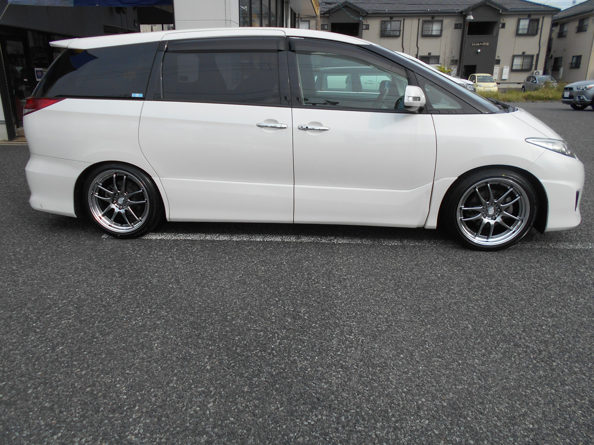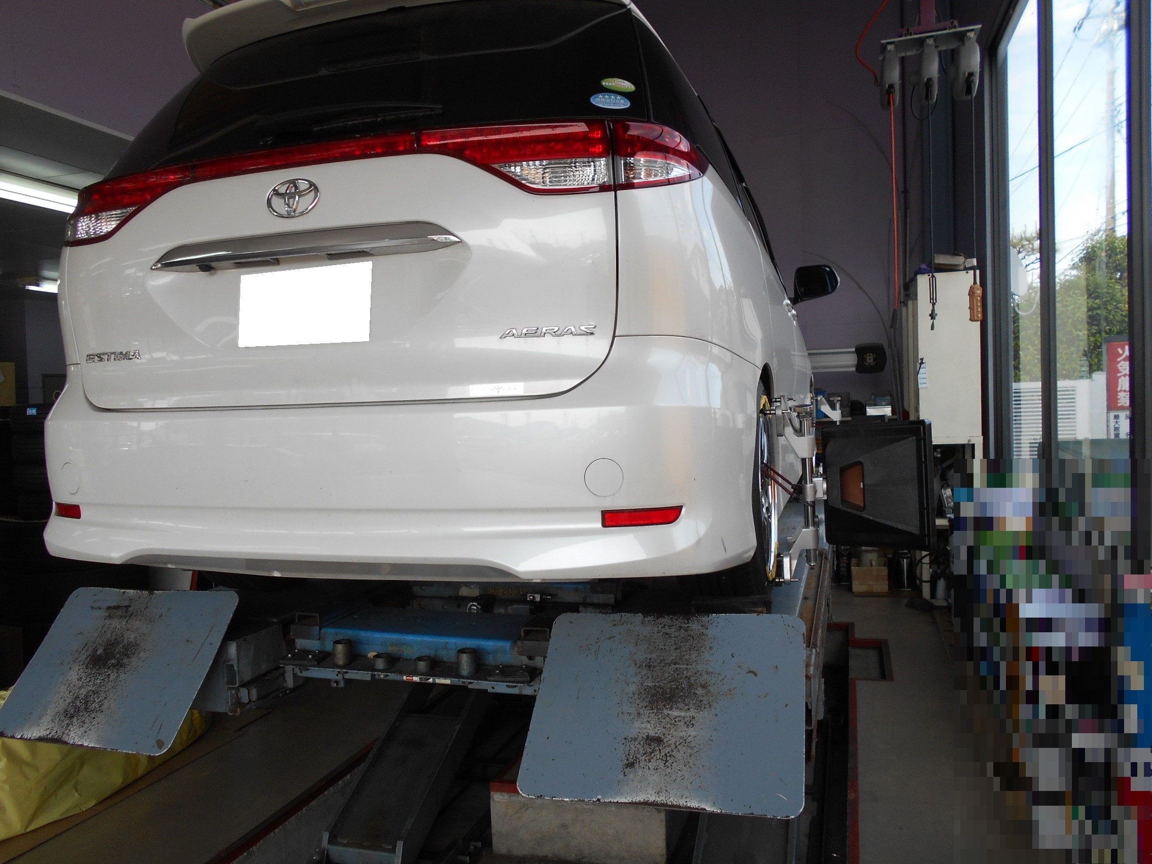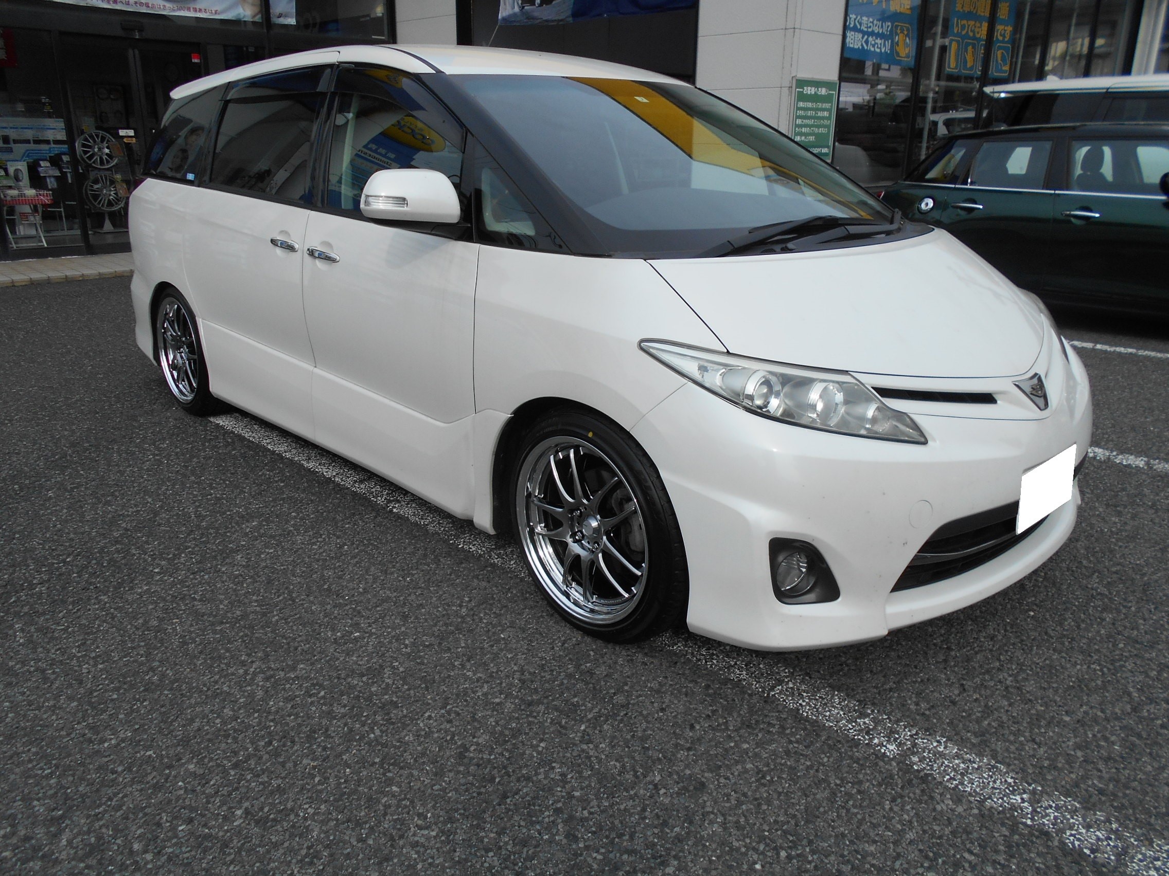 お次はトヨタ 50 エスティマにホイールはワークさんのワークエモーションCR、タイヤはプレイズ RVをセットしての装着。装着後にアライメントです。