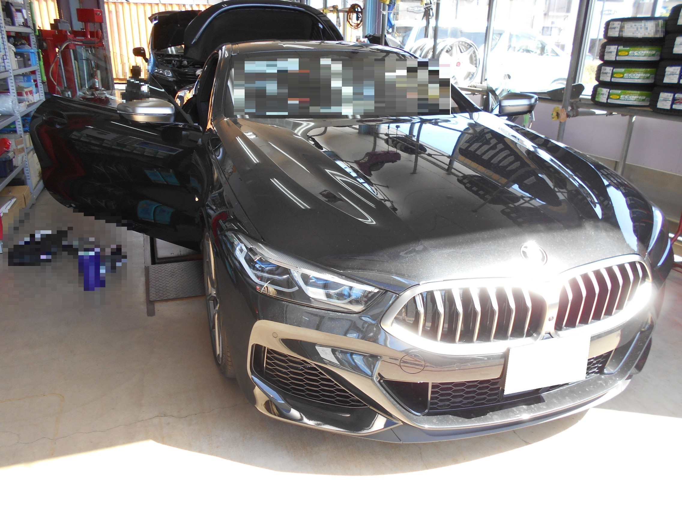 お次はBMW M850i G15にユピテルドライブレコーダー前後、レーダー取付です。後ろのPITでは足回り交換のホンダ オデッセイが入庫してます。