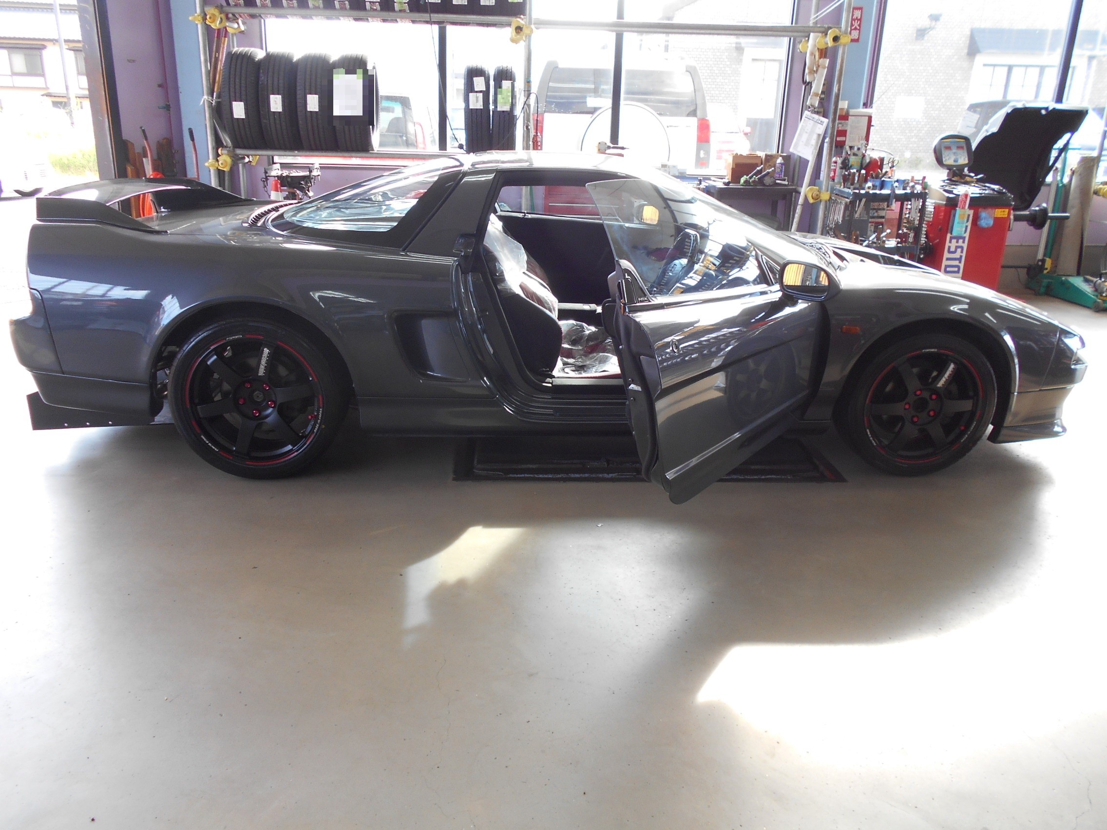 奥のPITでは、スズキ スイフトスポーツがクスコさんの車高調取付で入庫中。完全に隠れてますね^^;