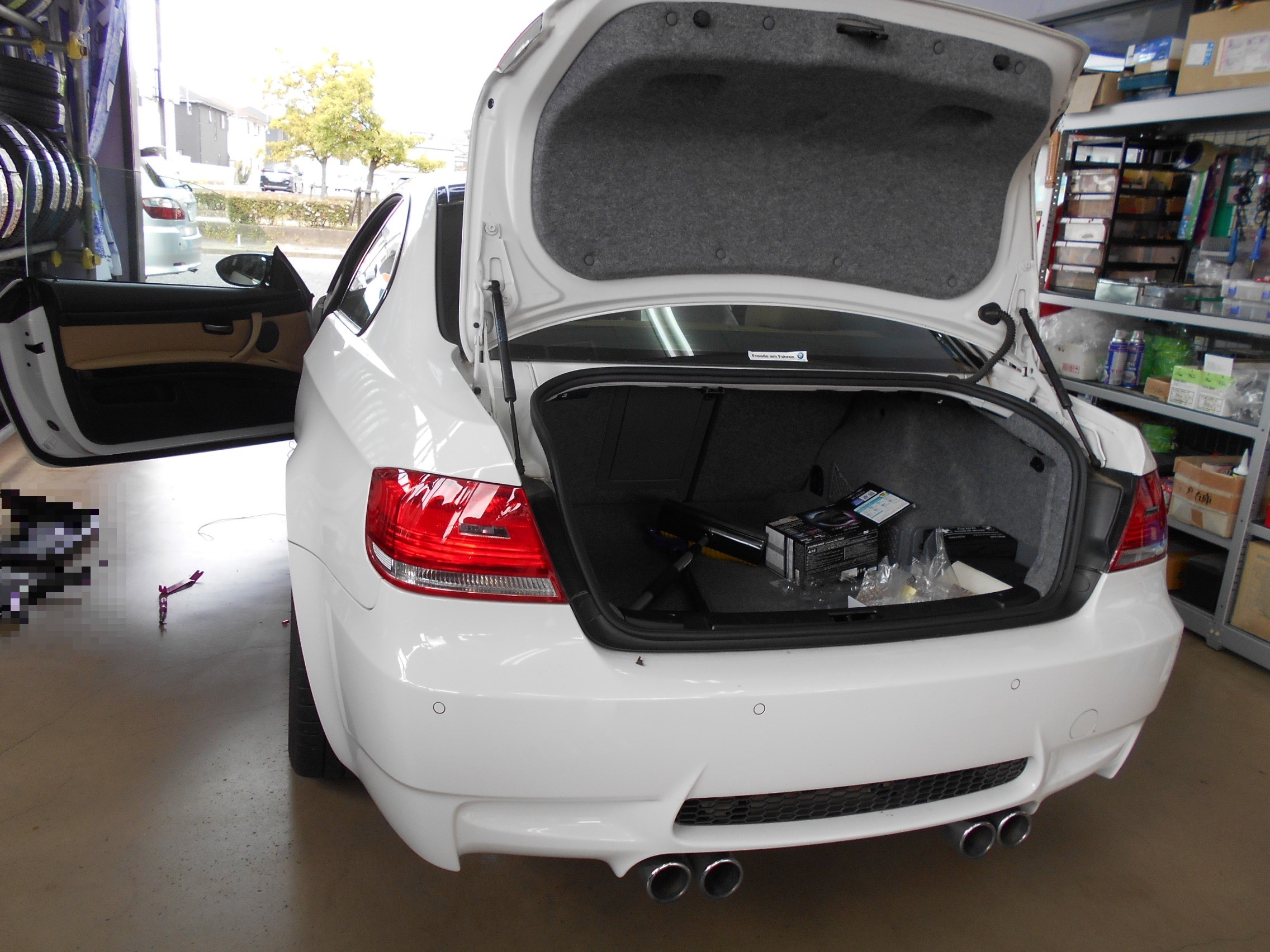 さて今日のPIT作業をご紹介。まずはBMW M3 E92が、ユピテルさんの前後ドライブレコーダーSN-TW80d & 駐車監視作動配線取付で入庫。
