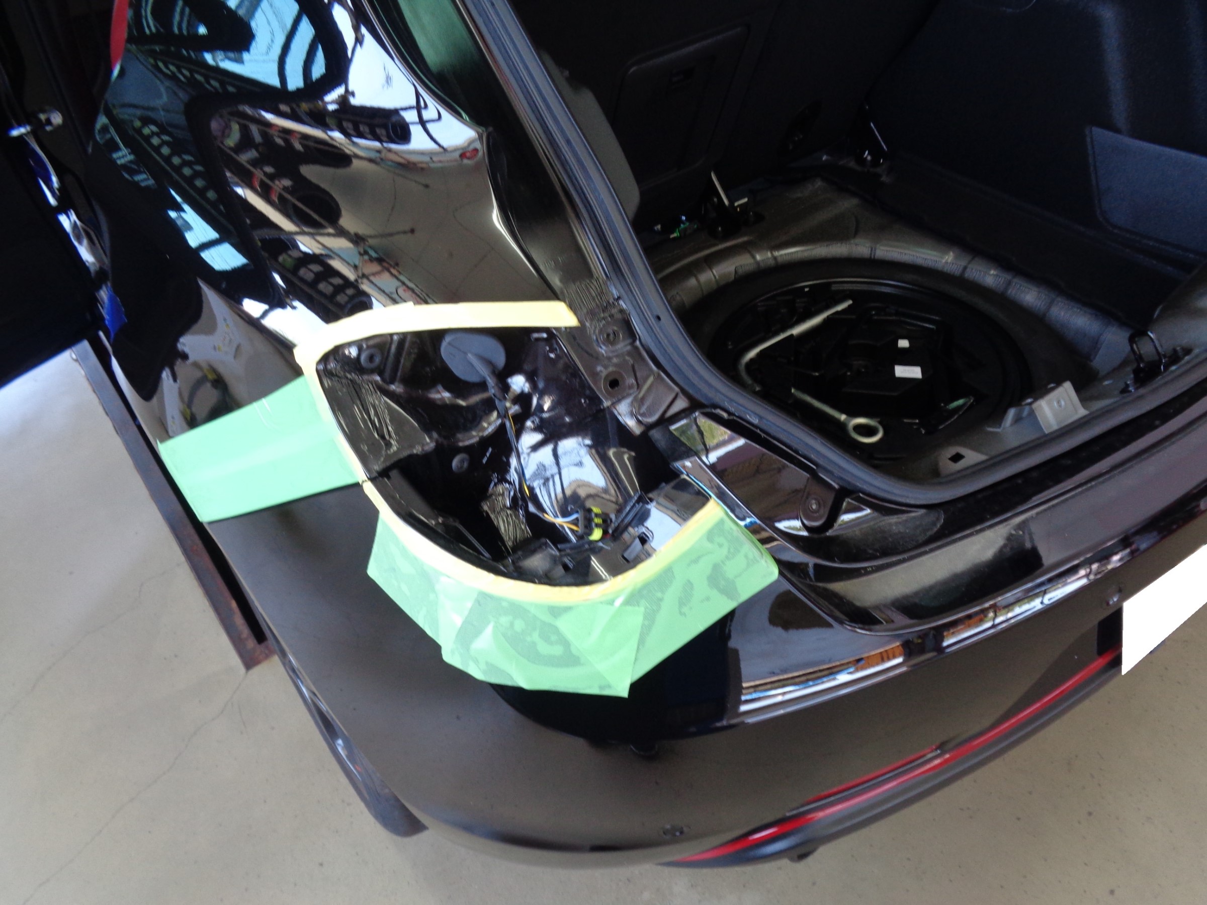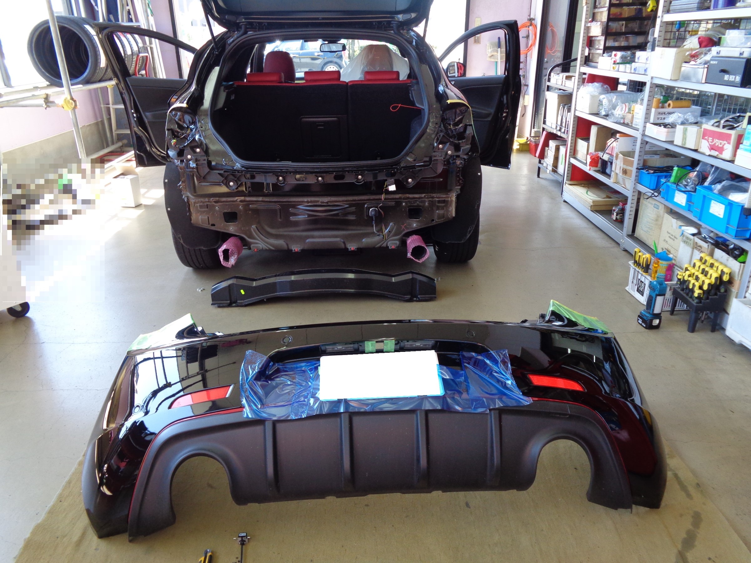 まずはバンパーを外す準備で養生し