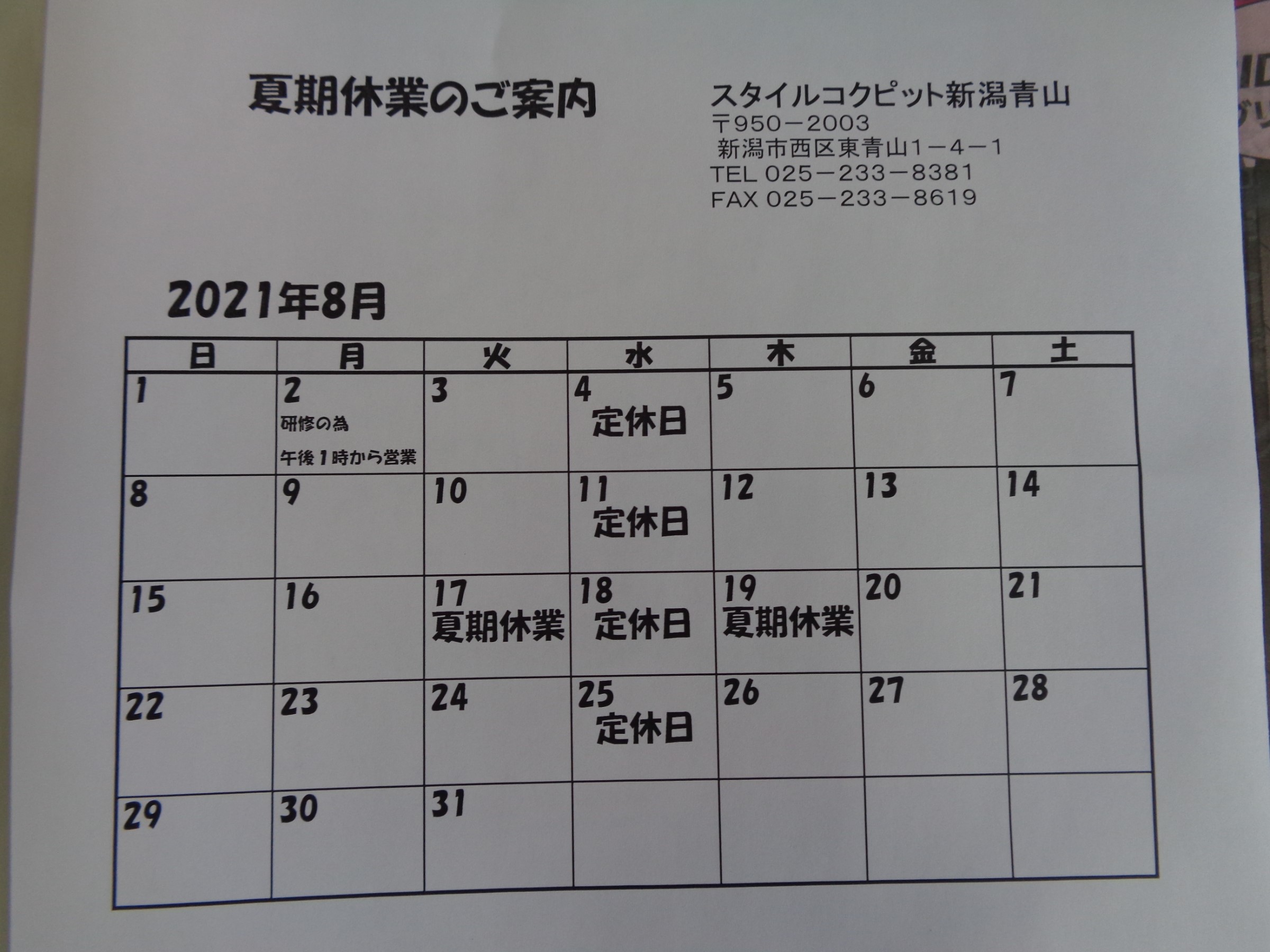 令和3年8月の営業日、営業時間のご案内です。