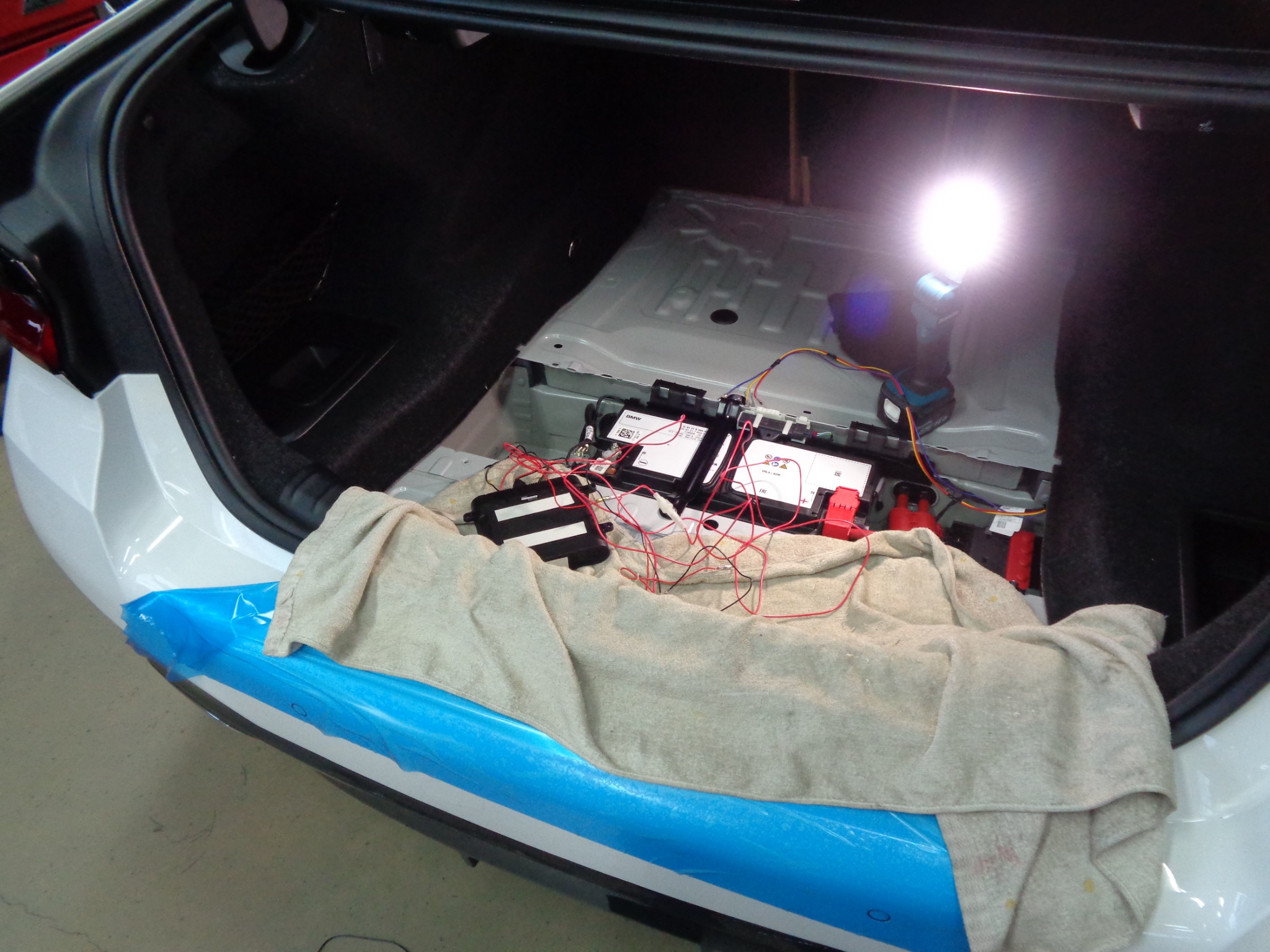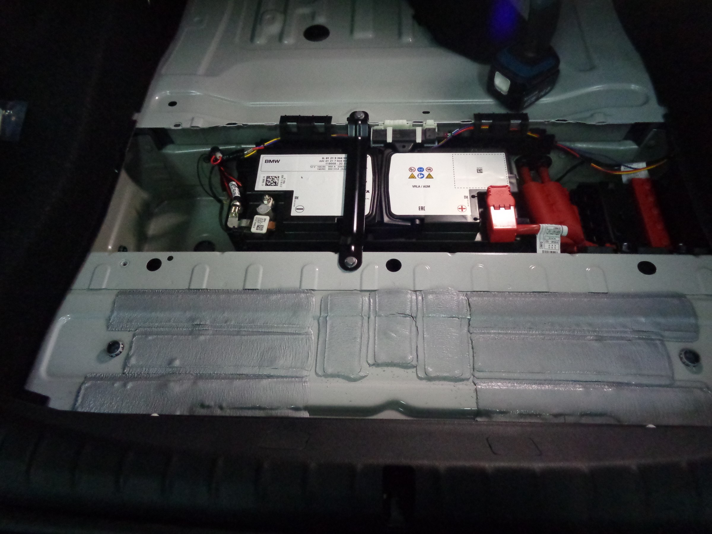 純正バッテリーの横に取付準備中↓