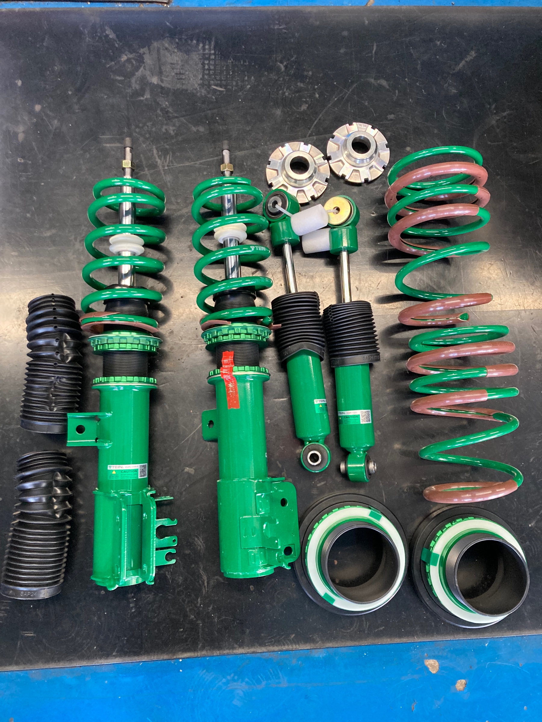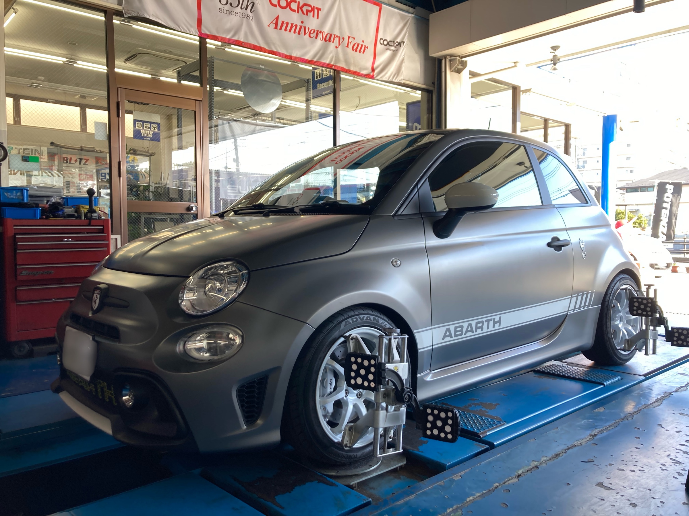 人気のアバルト595ですが、足回りに不満を持っているという話を良く聞きます。こちらのお客様も、もう少し乗り味を良くして、若干のローダウンもしたいとの事でした。そこで余り知られていないのですが、テインのフレックスZをオススメしました。