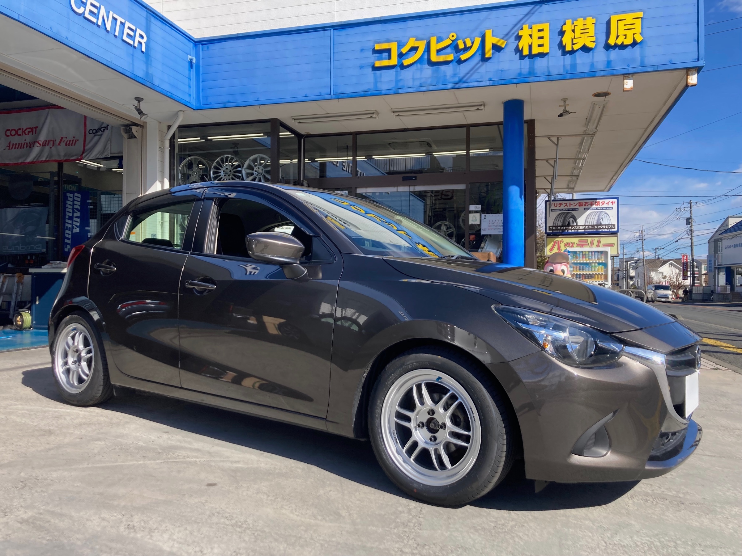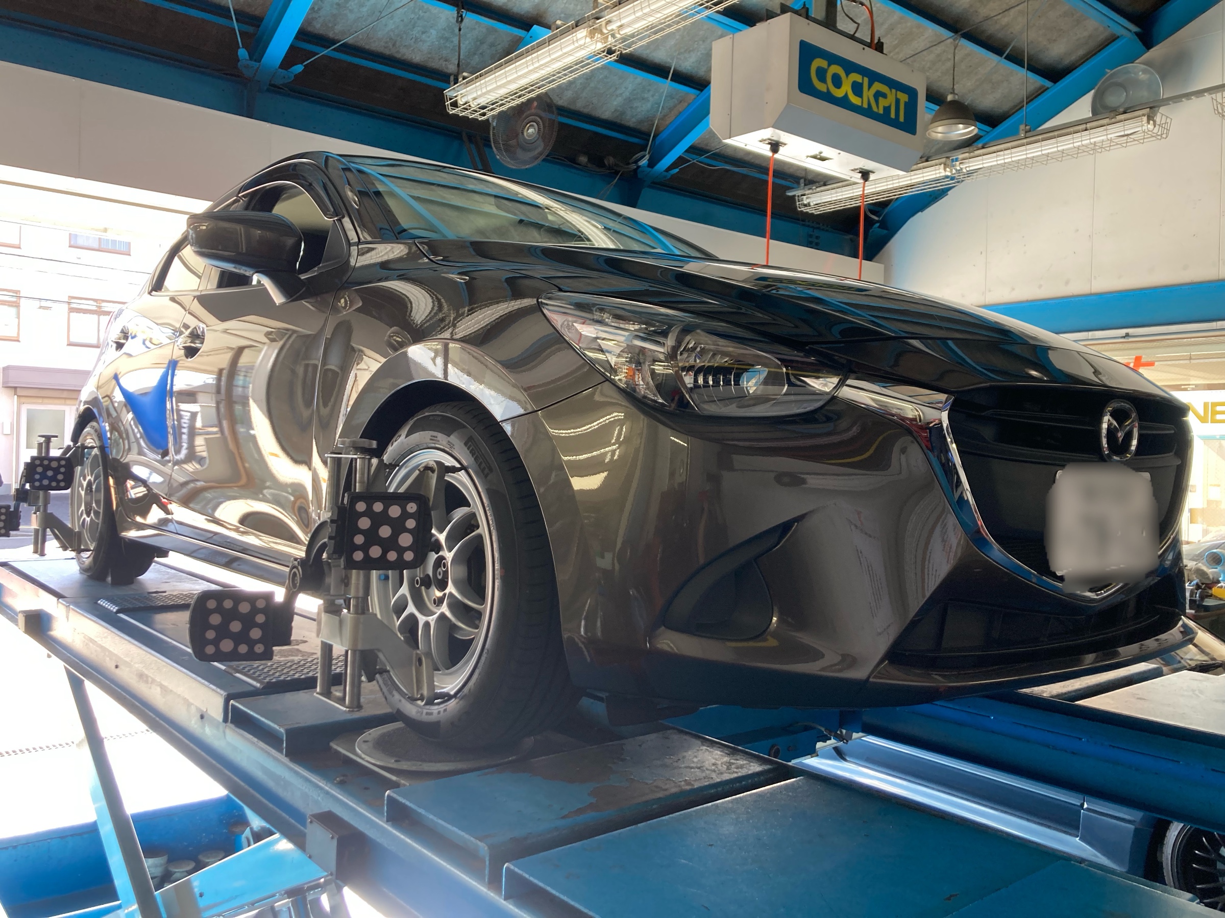 デミオに車高調を取り付けです。