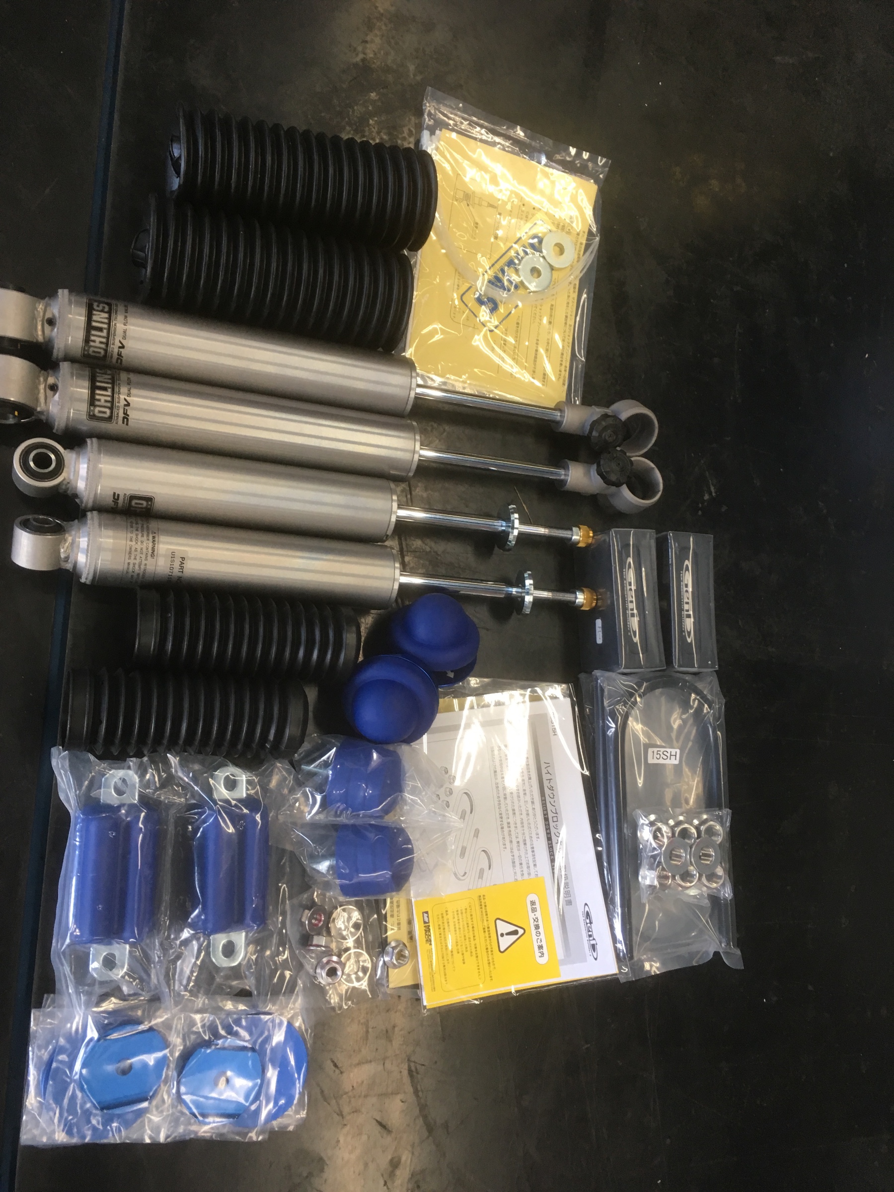 足回りは、当店で最近の定番のオーリンズのショックに玄武のストロークストッパーと、ロアリングブロックです。下がり過ぎず、安定した走りと、荷物を載せた時は減衰変更でしっかりした走りができるのです。