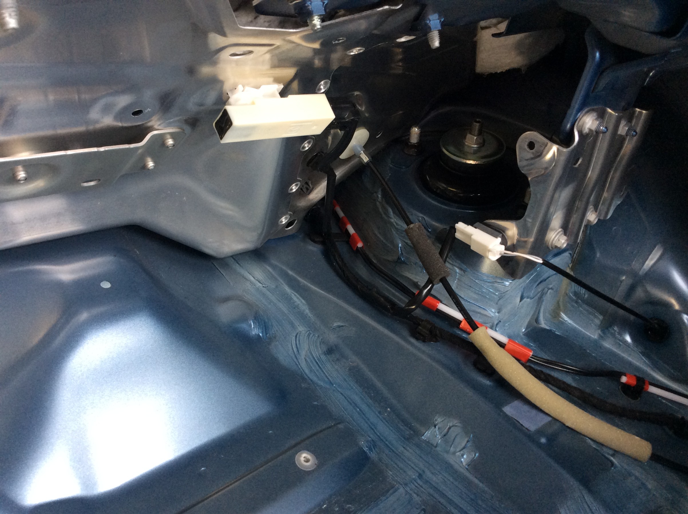 フロントのトップのナットはボンネットを開けば見えるのですが、リアはトランクの内貼りを外さなければ現れません(ちょっと狭い感じです)。