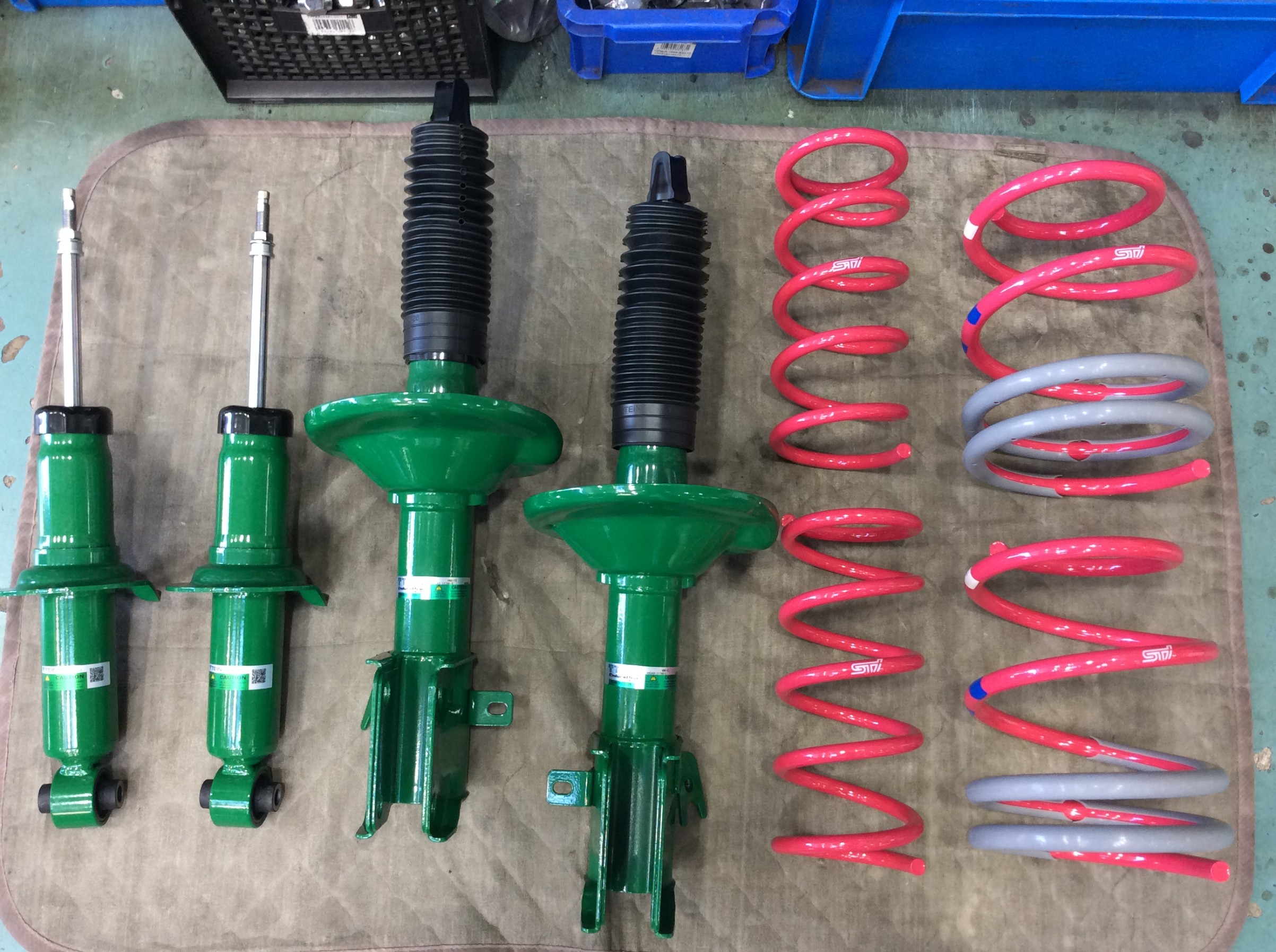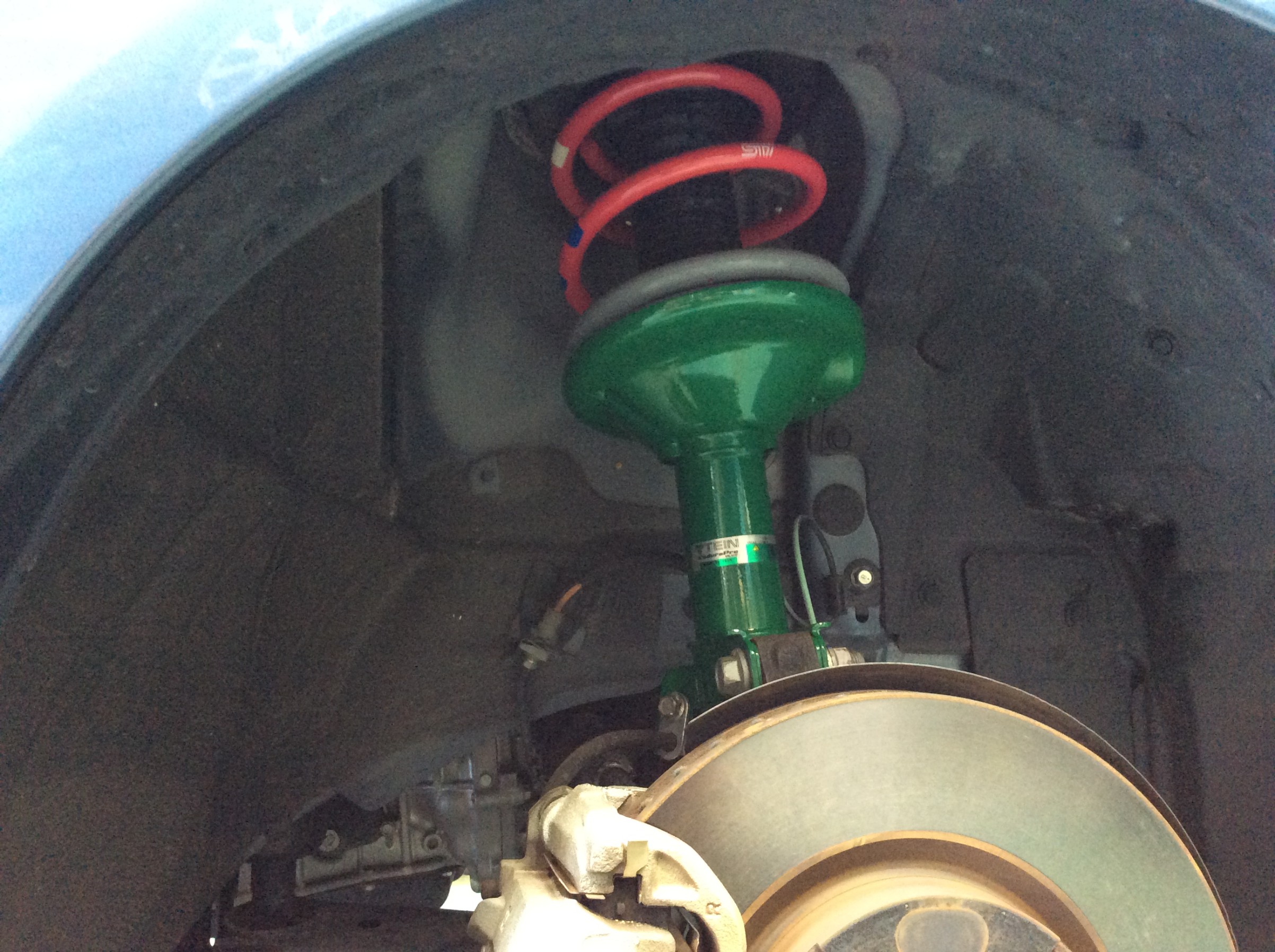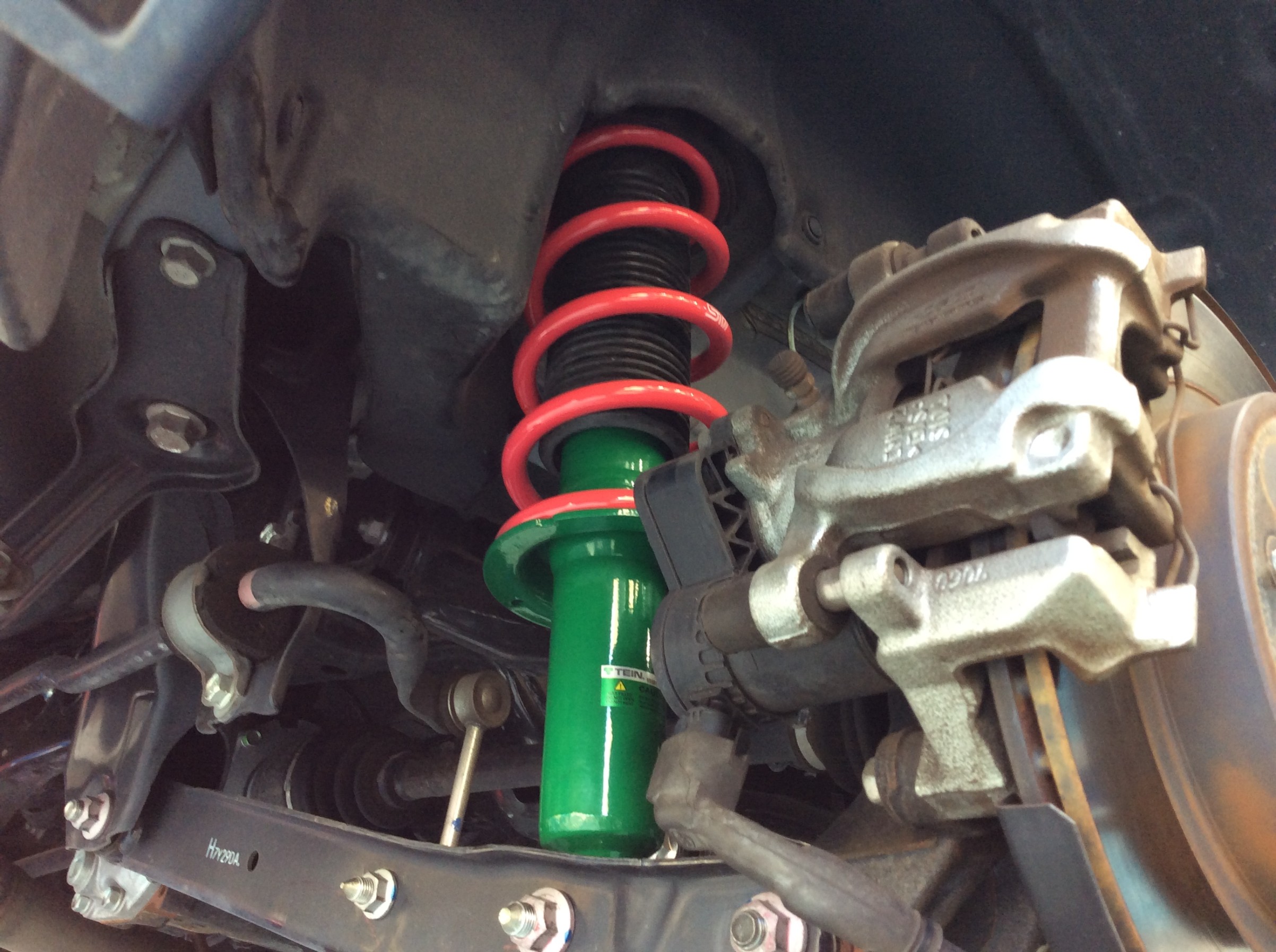今回はテインさんのEnduraPro PLUS(減衰力調整付き)に、STIさんのスプリングのセットで取付させていただきました。