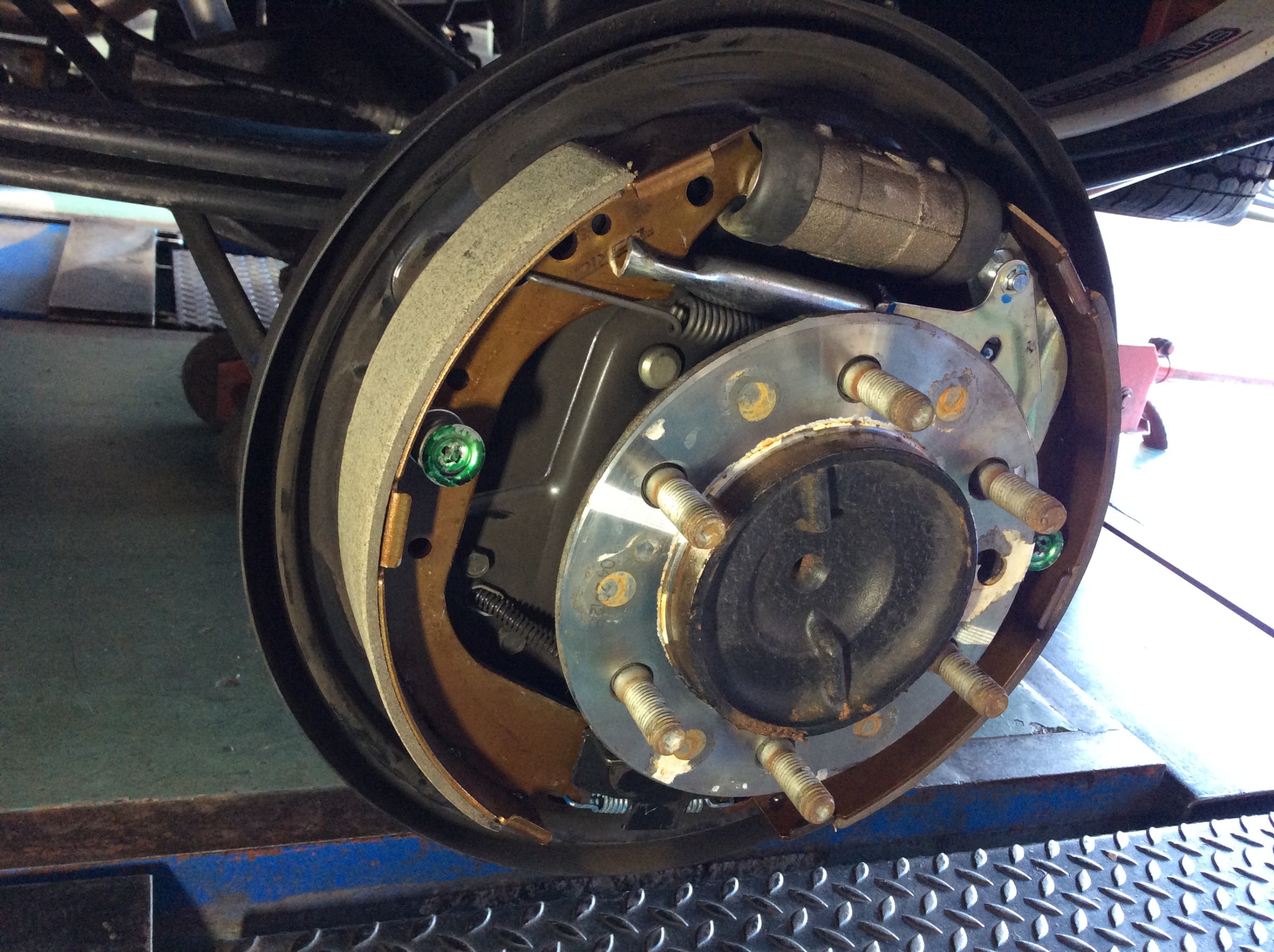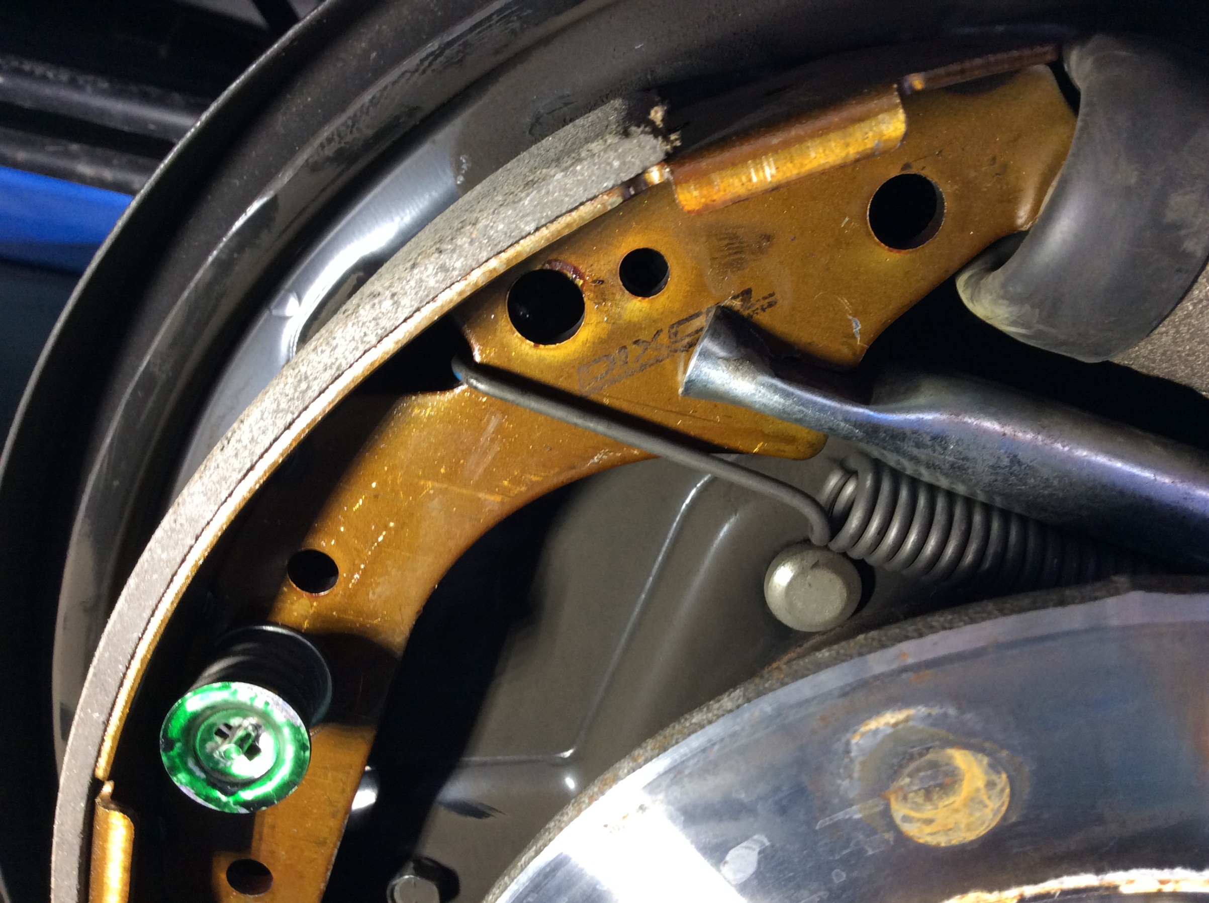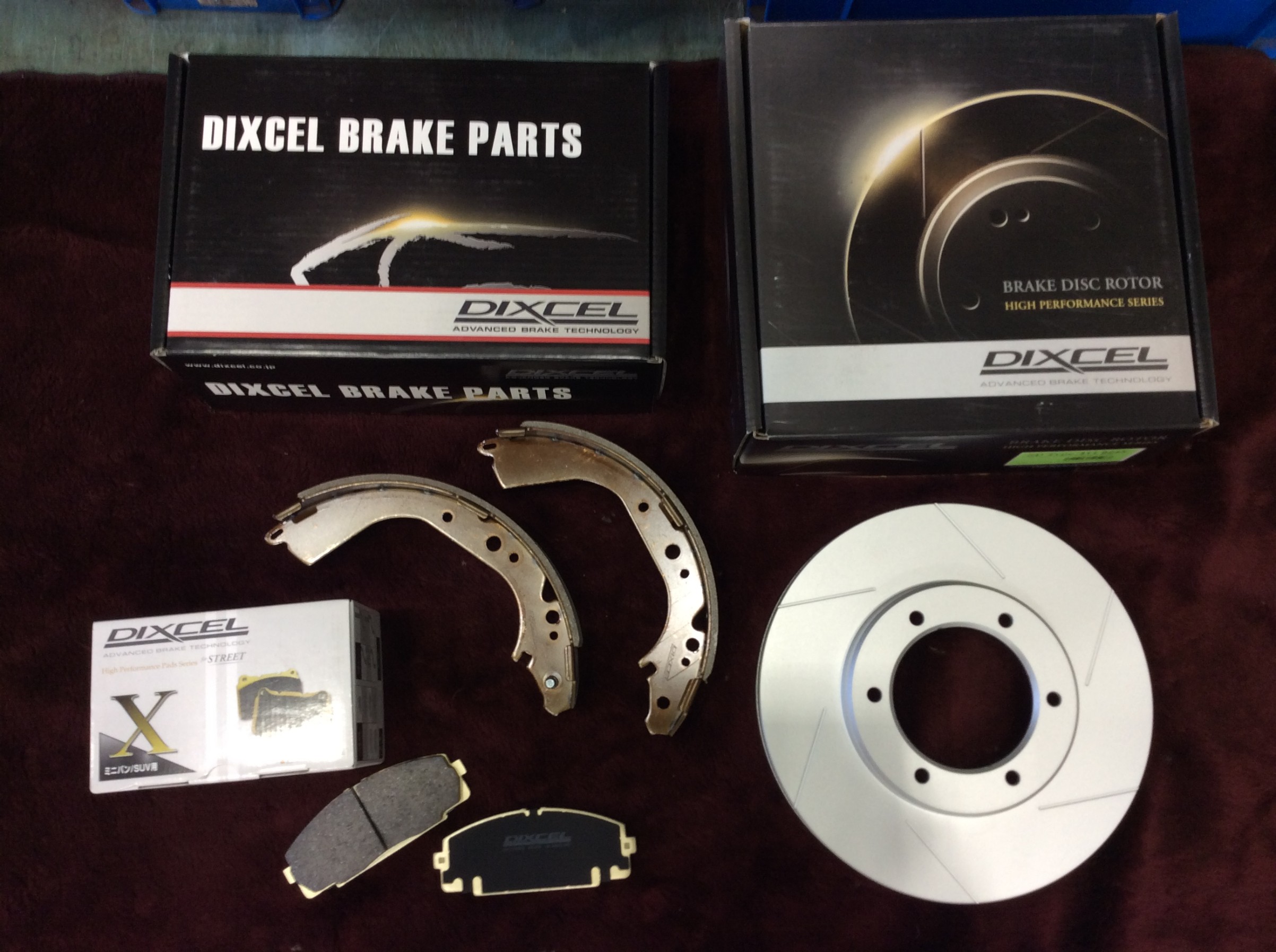 ディクセルさんのスリット入りローター「Type SD」&ブレーキパッド「Type X」をフロントに。リアのシューも「Type RGX」に交換しています。