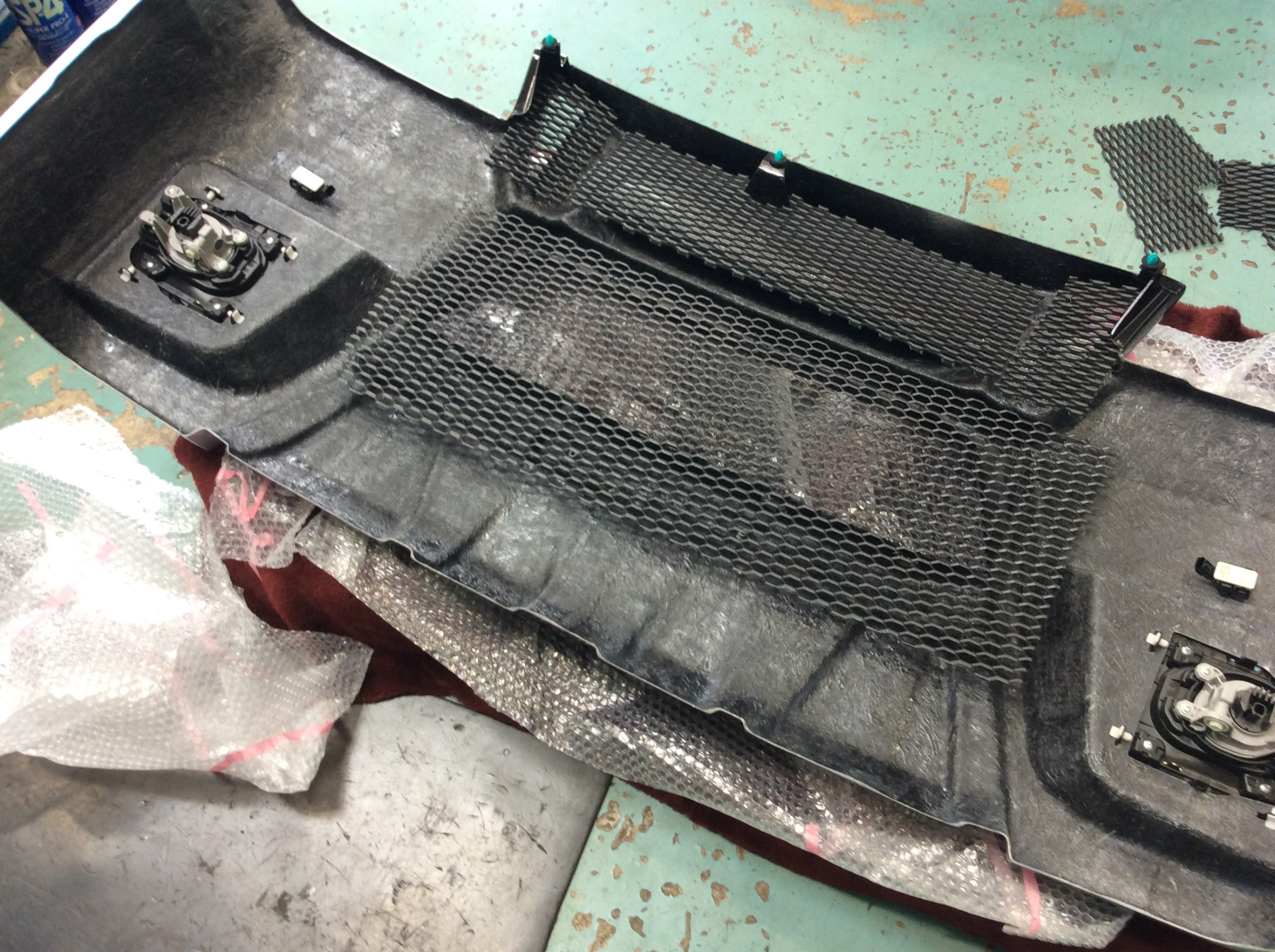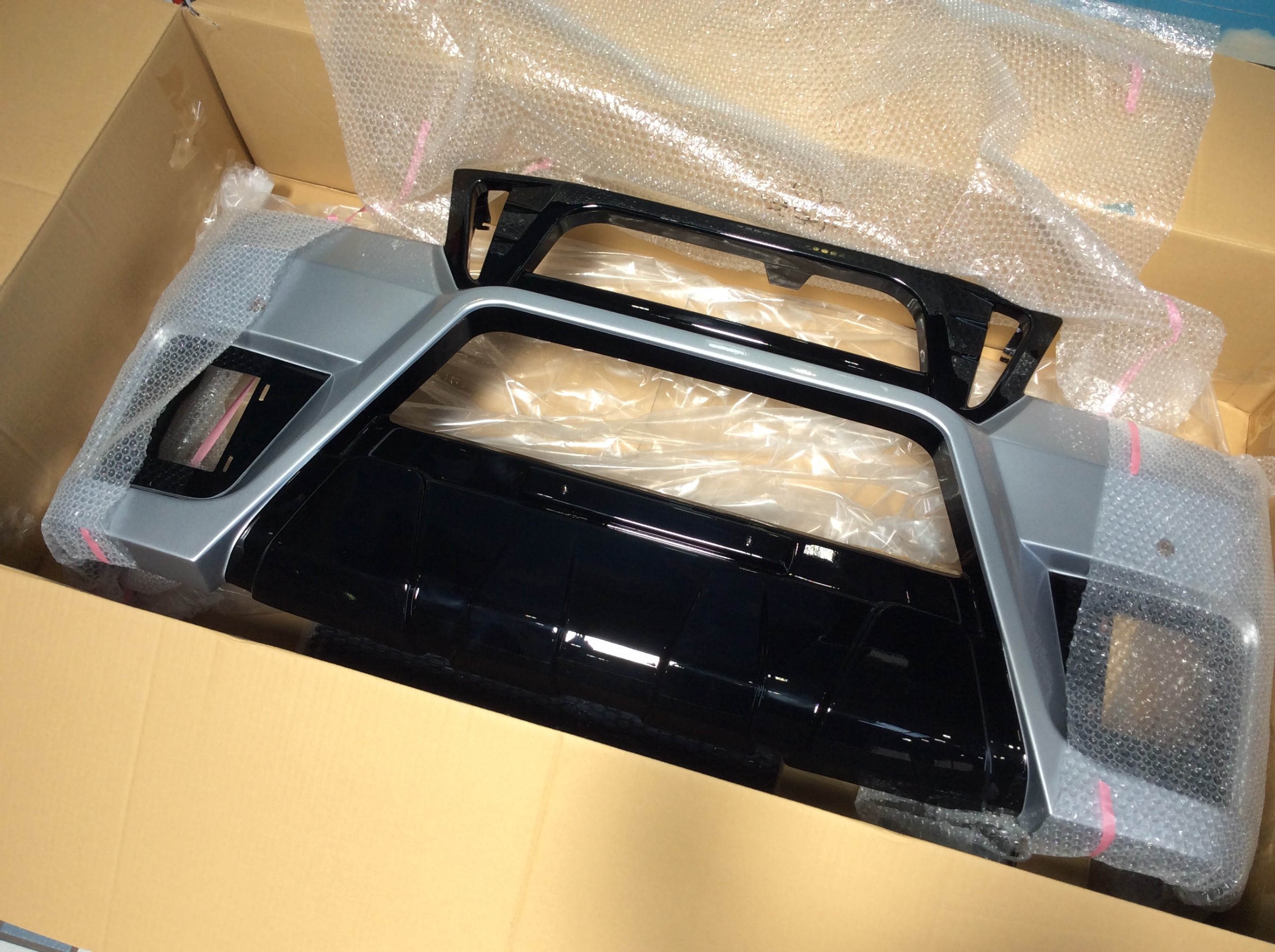 新たに取り付けるエアロバンパーのメッシュ部分から車体色のシルバーが見えるのはチョット・・・って事だったので、見える部分をブラックのスプレーにて塗装いたしました。