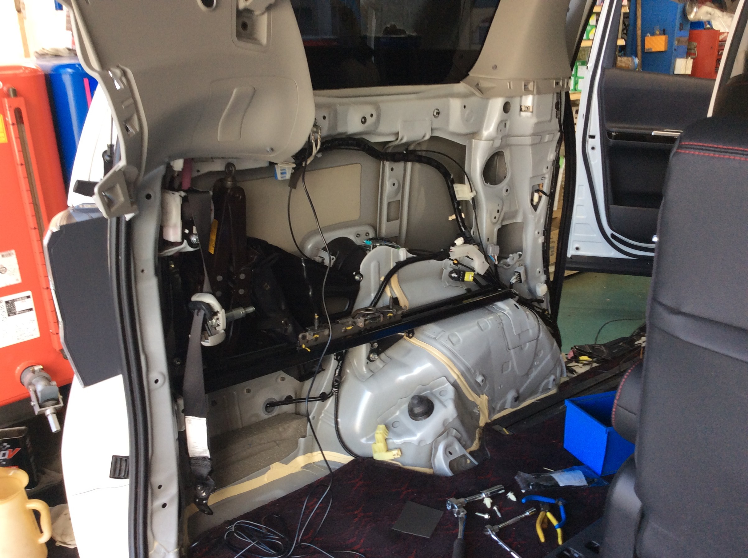 交換にあたり、久々にサードシートを外し内貼りを外します。既存の配線を取り除きながら、新たに新品のカメラの配線を通していきます。