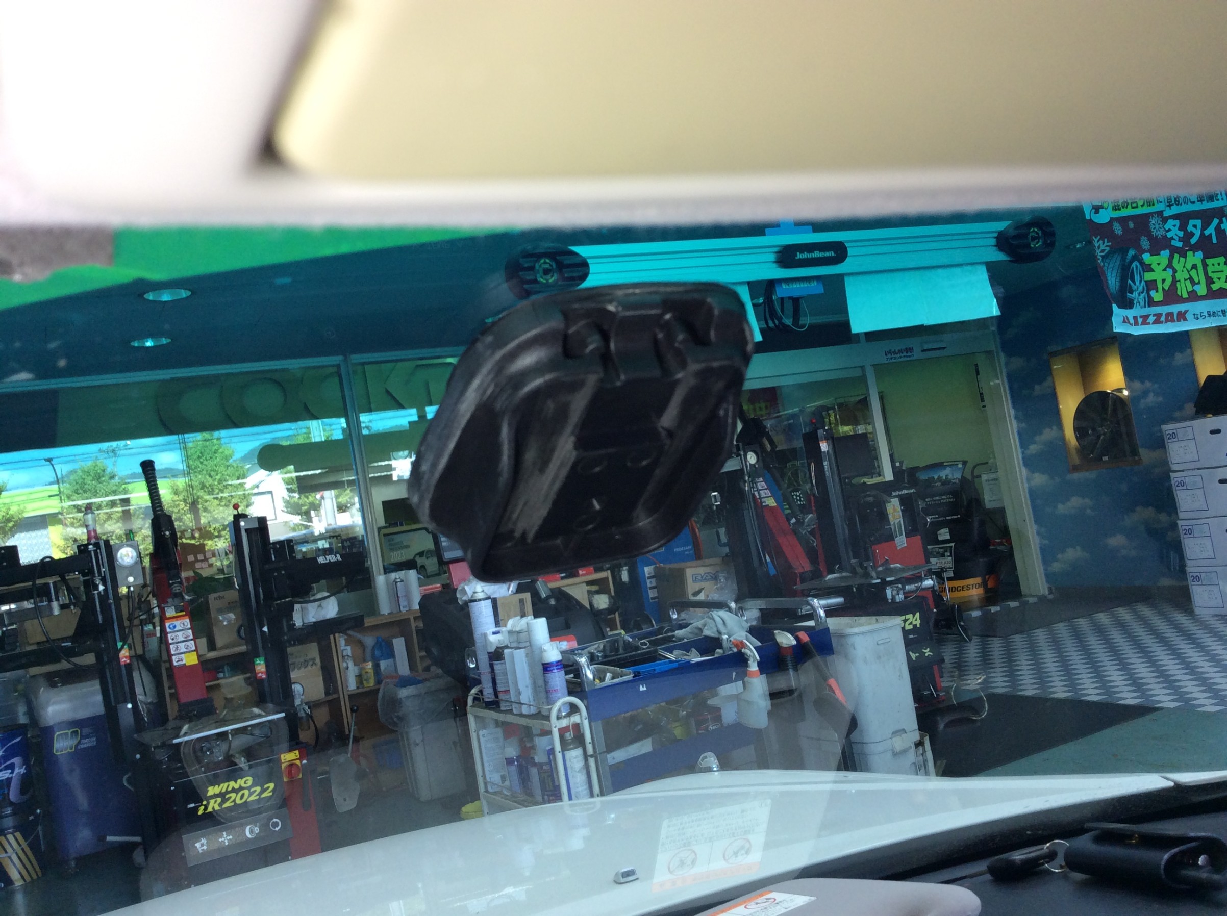 フロントカメラはいつもの様に視界の邪魔にならないミラー左の出来る限り上に取り付け。