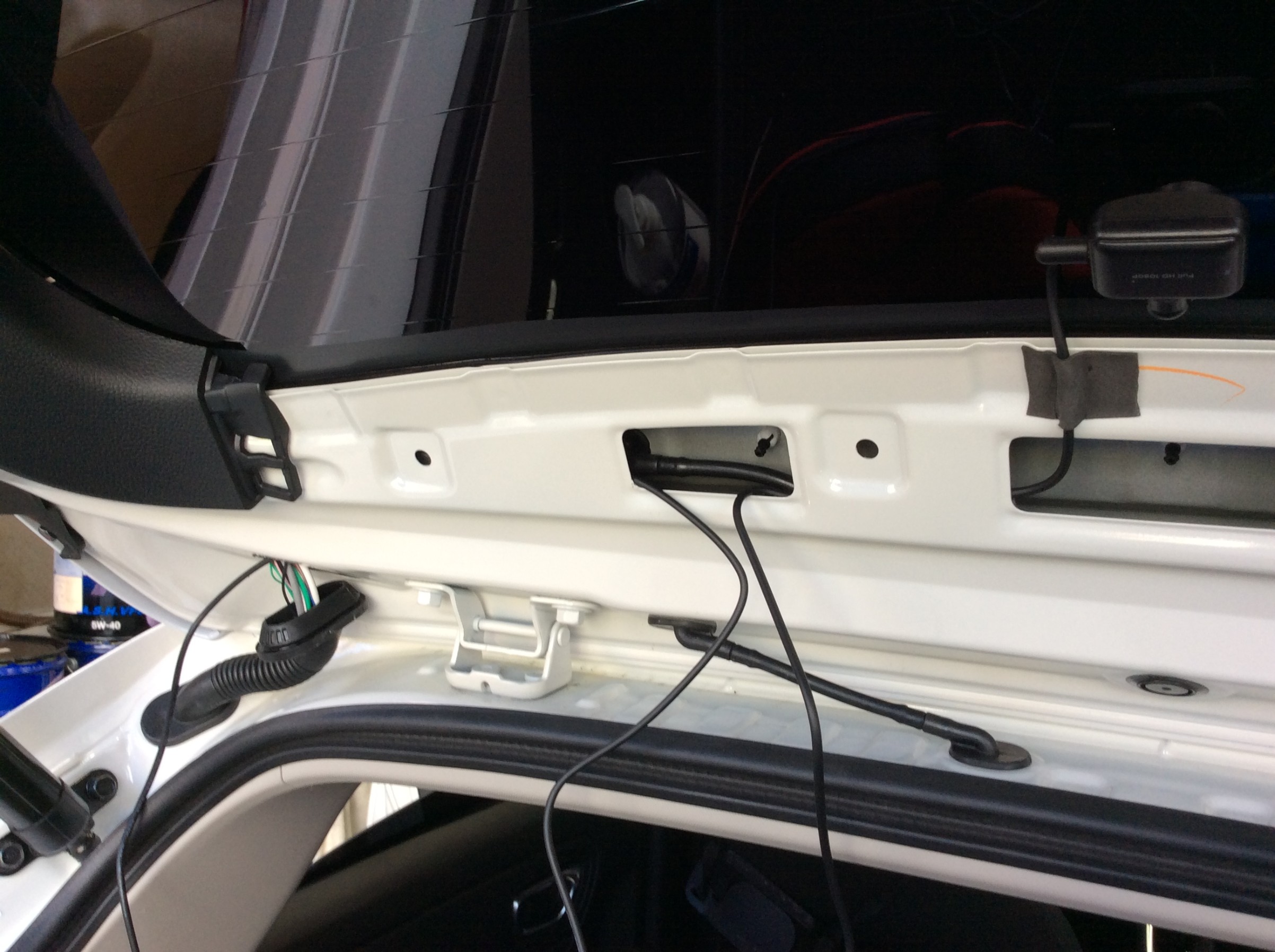 リアカメラはいつもの様に上部中央に貼り付け、配線をリアゲートからジャバラの中を通して前までもっていきます。