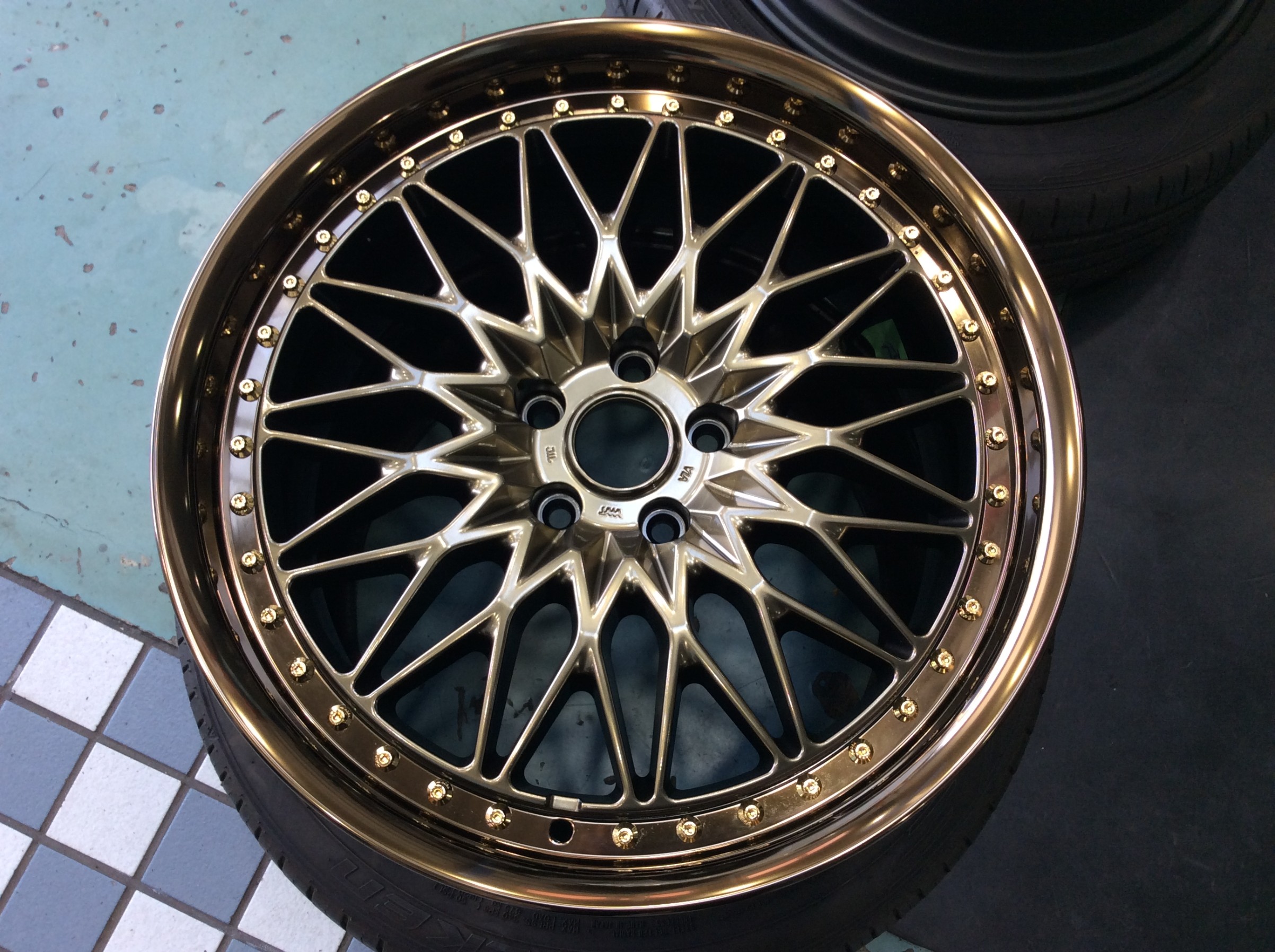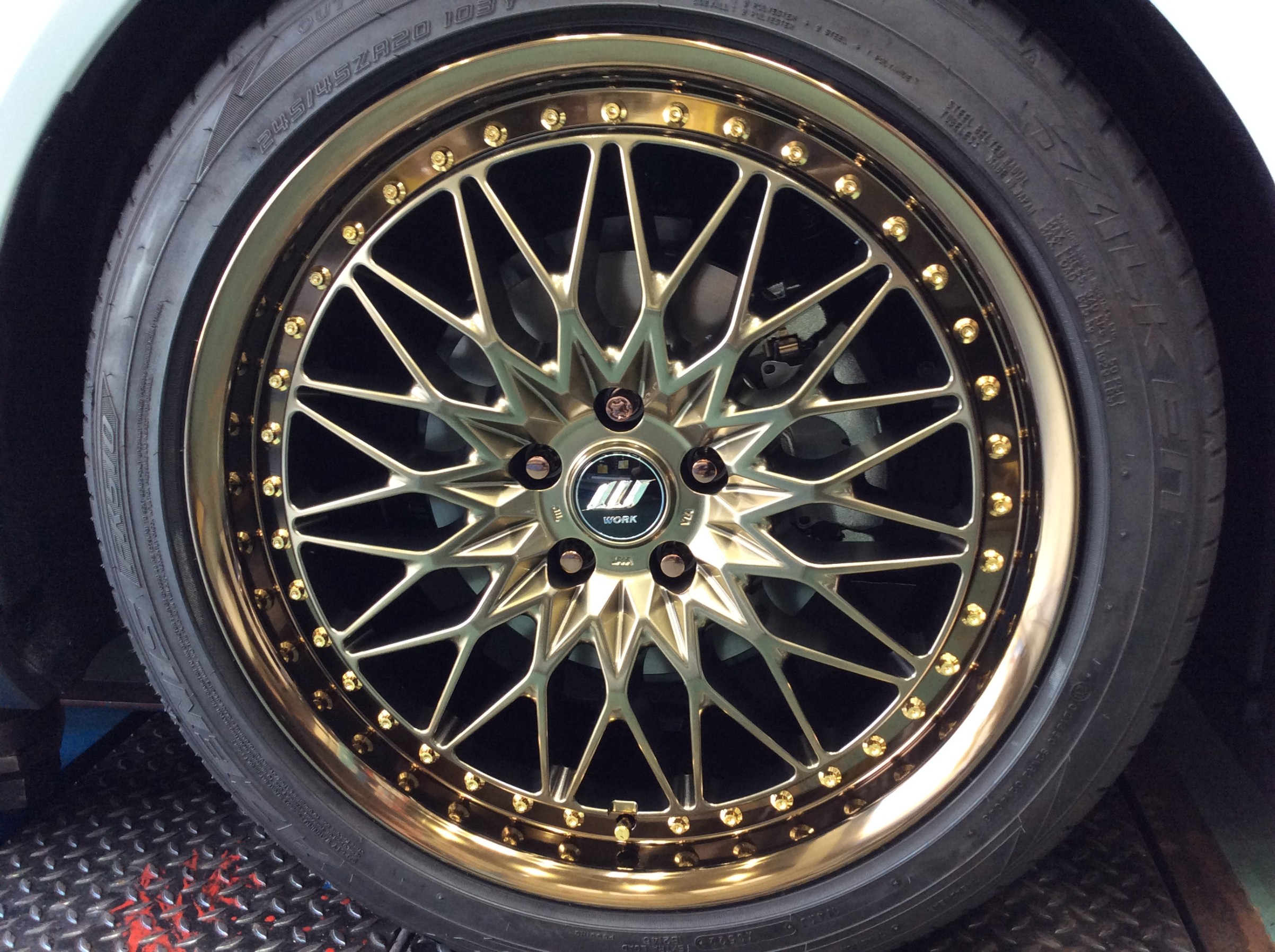 オーナーさんが一目惚れしたワークさんのVS XVの限定カラー(ラスターブロンズゴールド)のホイールを装着します(もう販売は終了しています)。