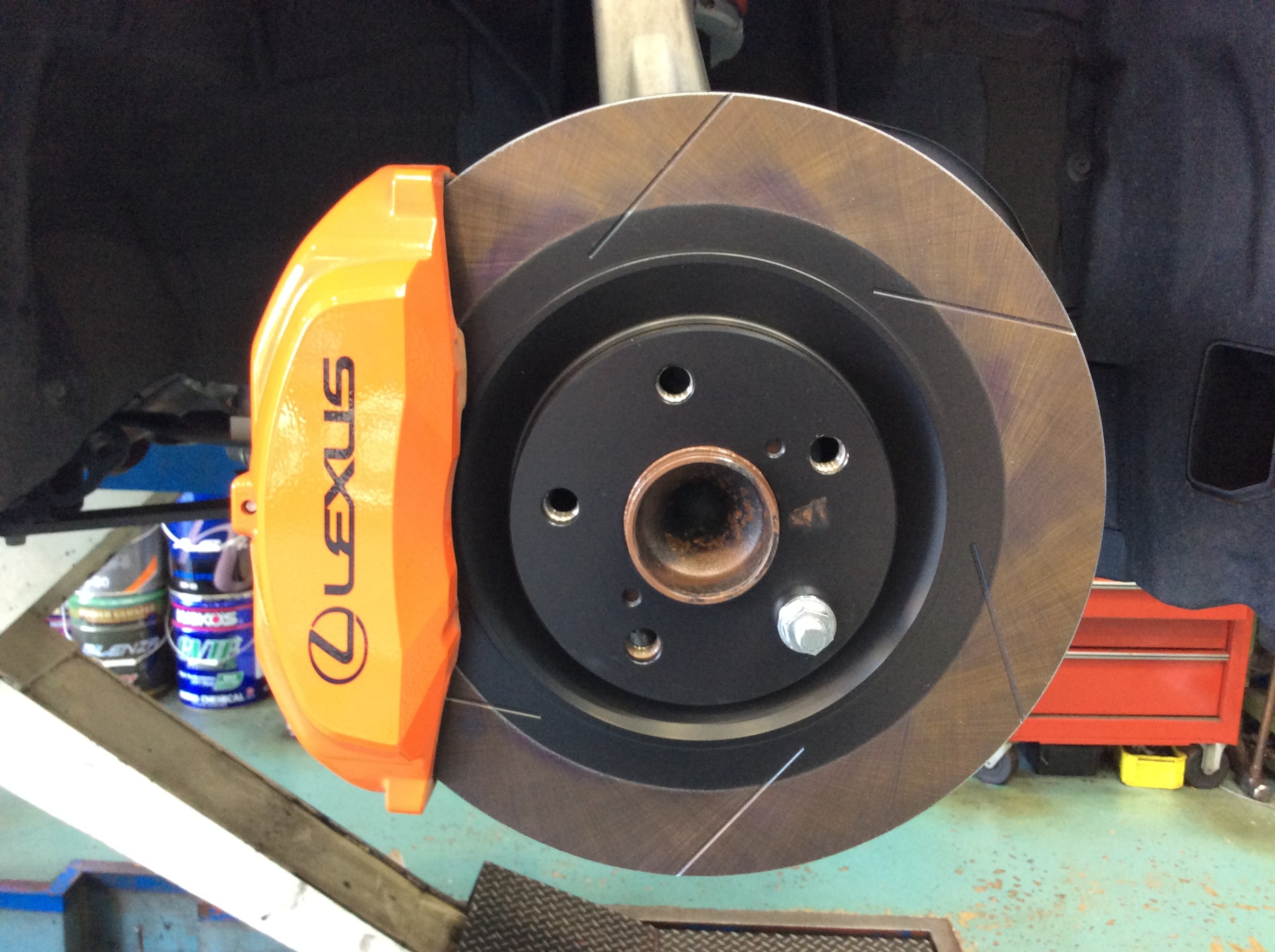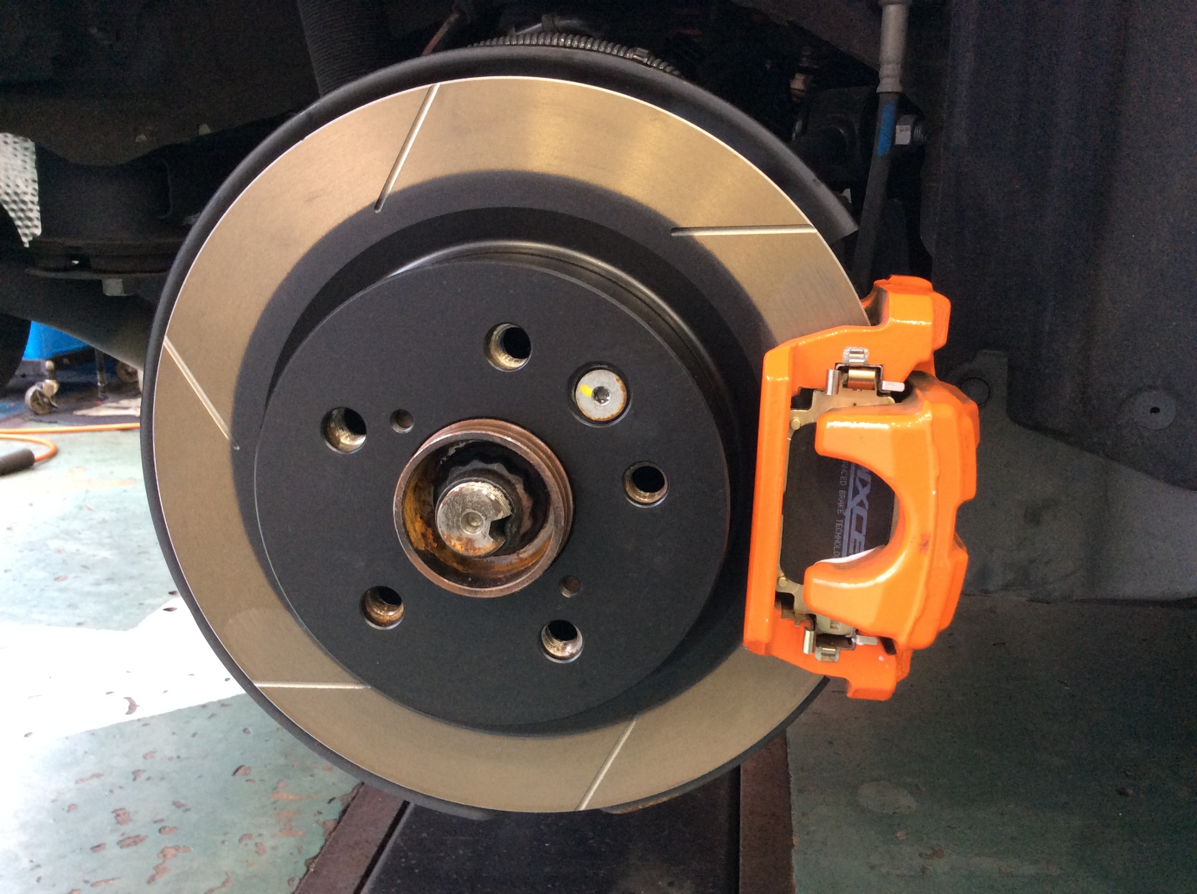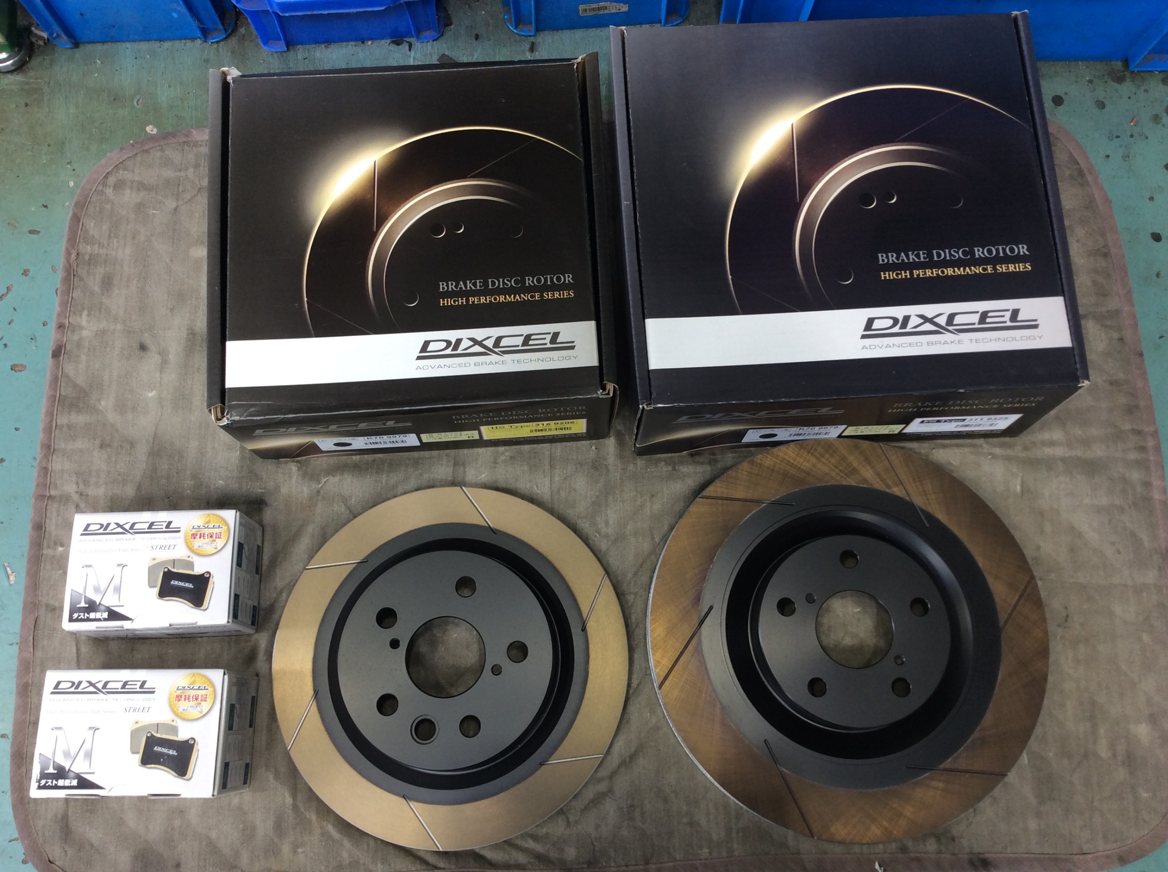 今回はパッドの食いつき、ブレーキ鳴き等を考慮してフロントにはディクセルさんの熱処理加工スリットローターFSタイプ、リアはこれまた熱処理加工スリットローターHSタイプをチョイスし、ダスト超低減パッドMタイプを組み合わせて取付しました。