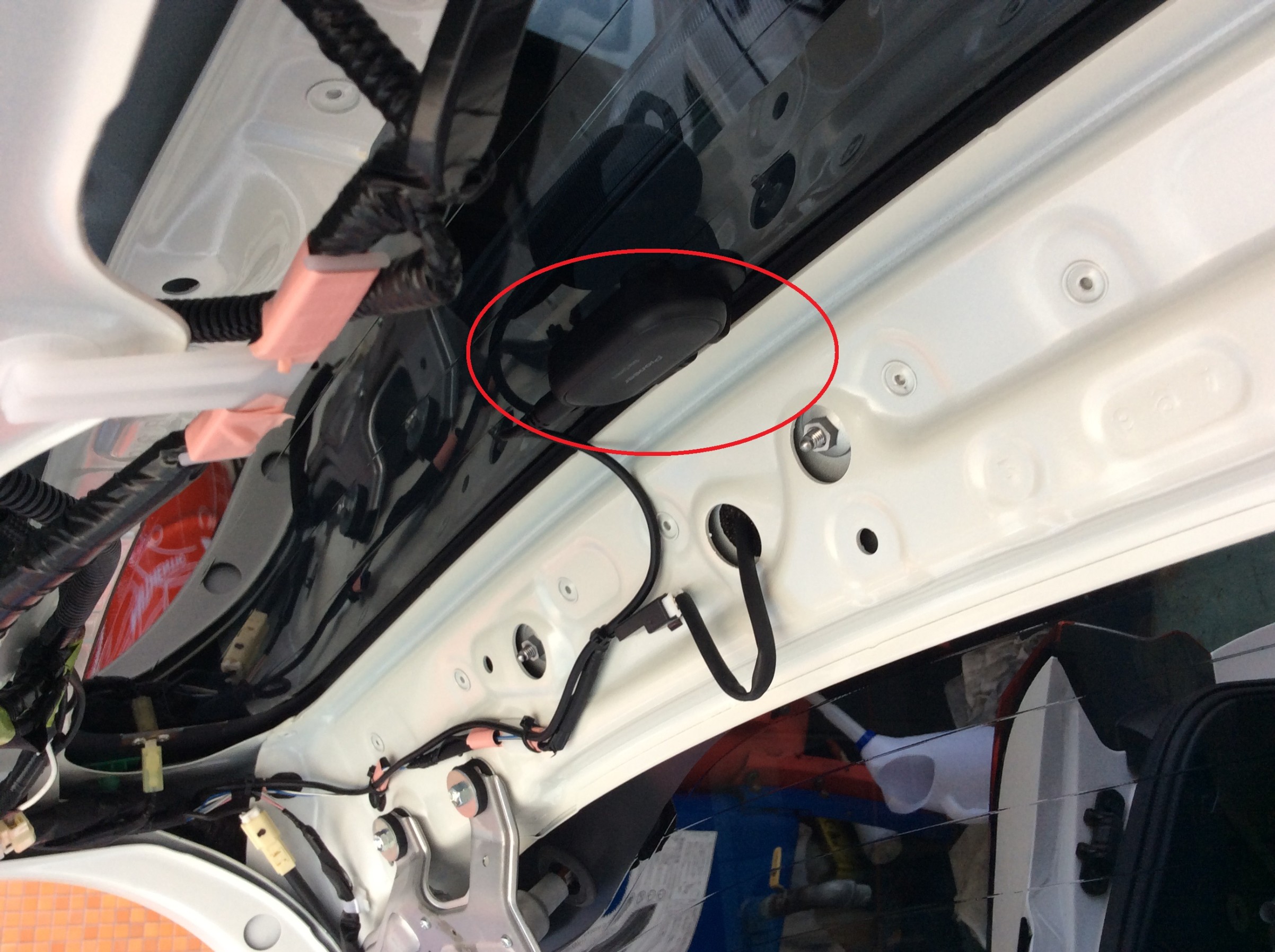 下側のガラス中央上側にカメラを貼り付け配線していきます。