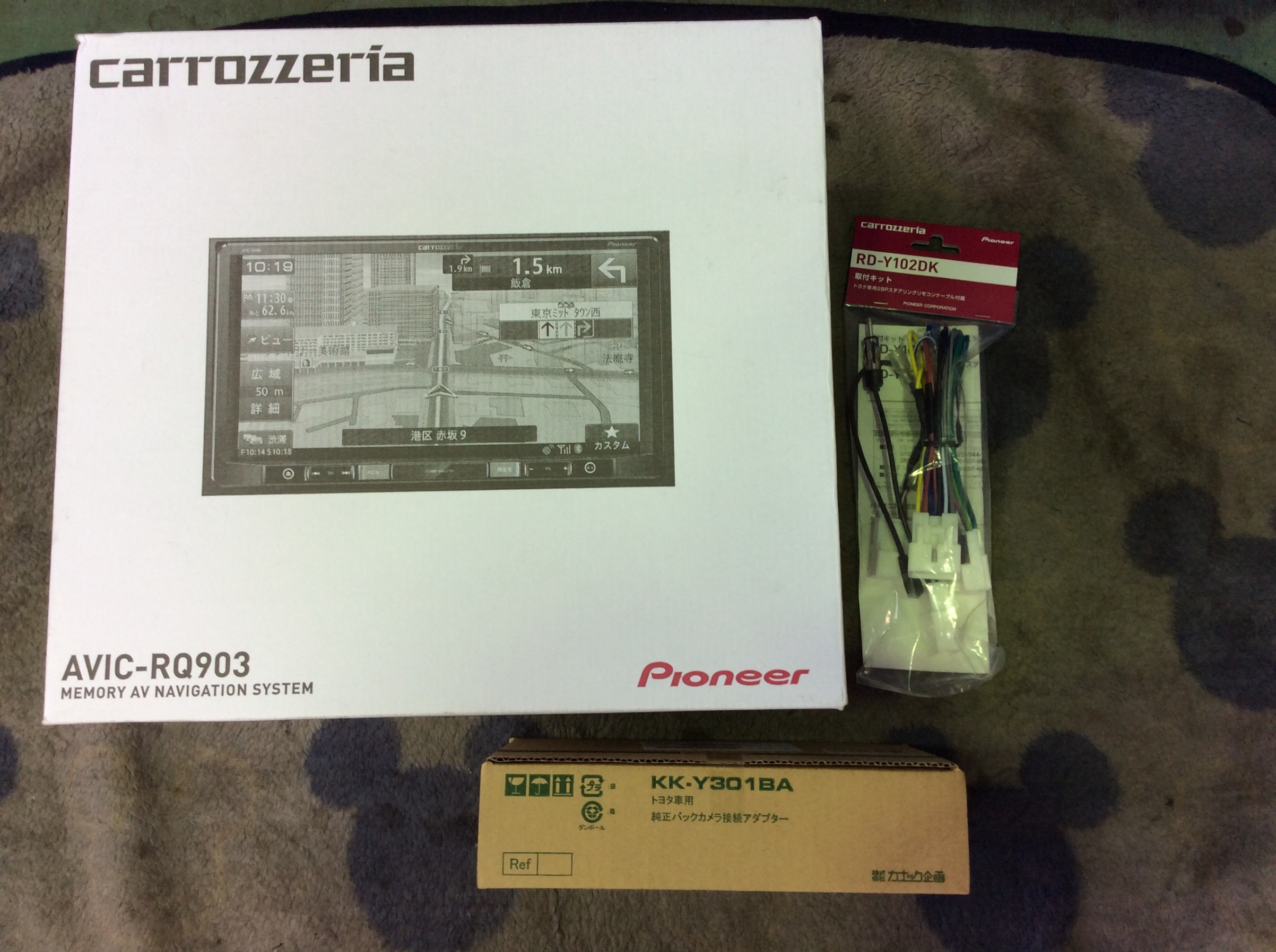オーディオレスにて購入され、当店でナビを取り付けしていただける事になりましたので、今回も取付最大のパイオニアさん9インチ(AVIC-QR903)を取り付けさせていただきました。(ナビレディセットの為、純正バックカメラを活かす為、変換アダプターも取り付けます。)