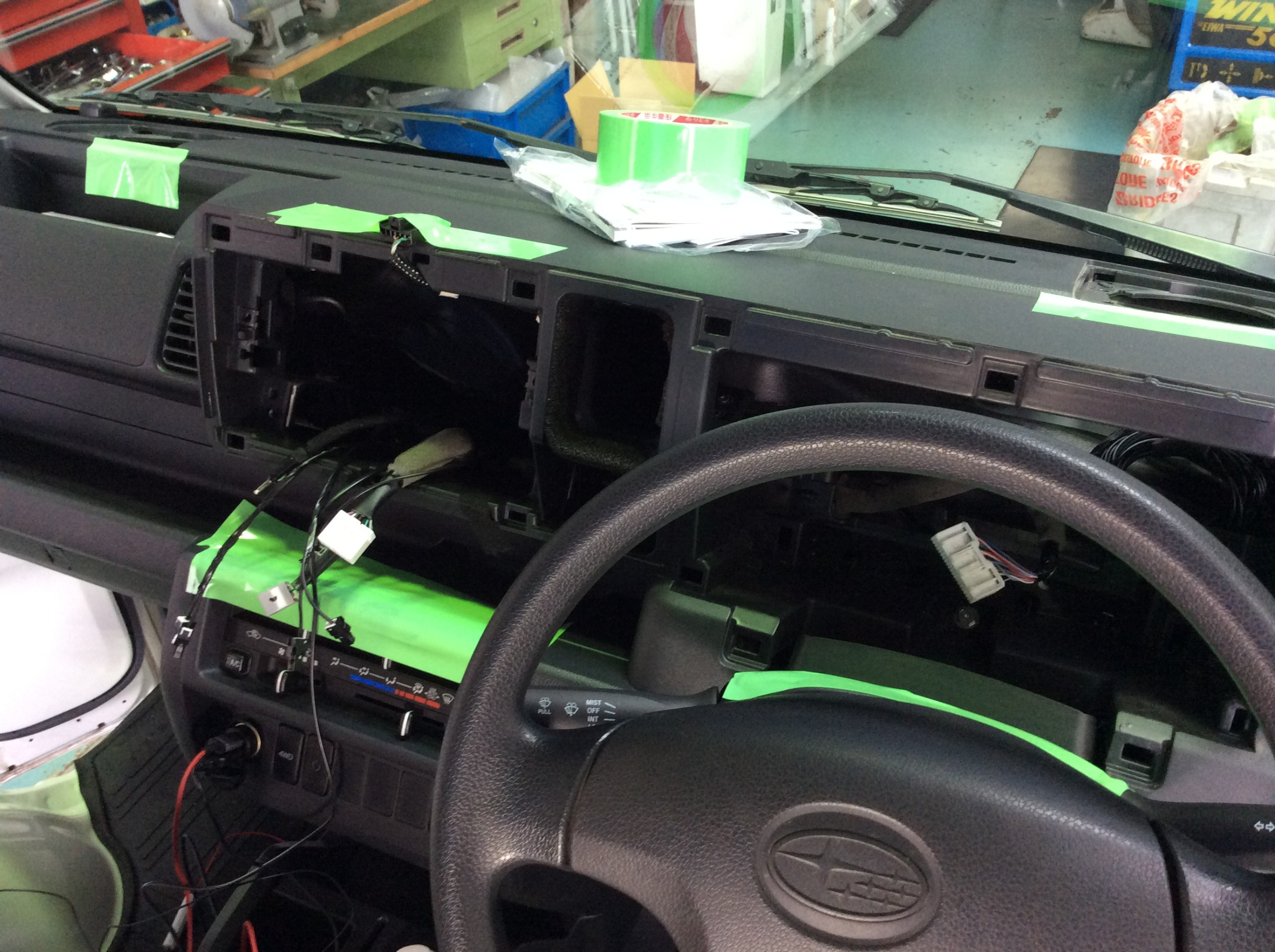 作業は軽トラックの為、Aピラーは鉄板がむき出し!TVアンテナ&ETCアンテナの配線を隠すのに苦労をしながら進めていき何とか配線処理を・・・