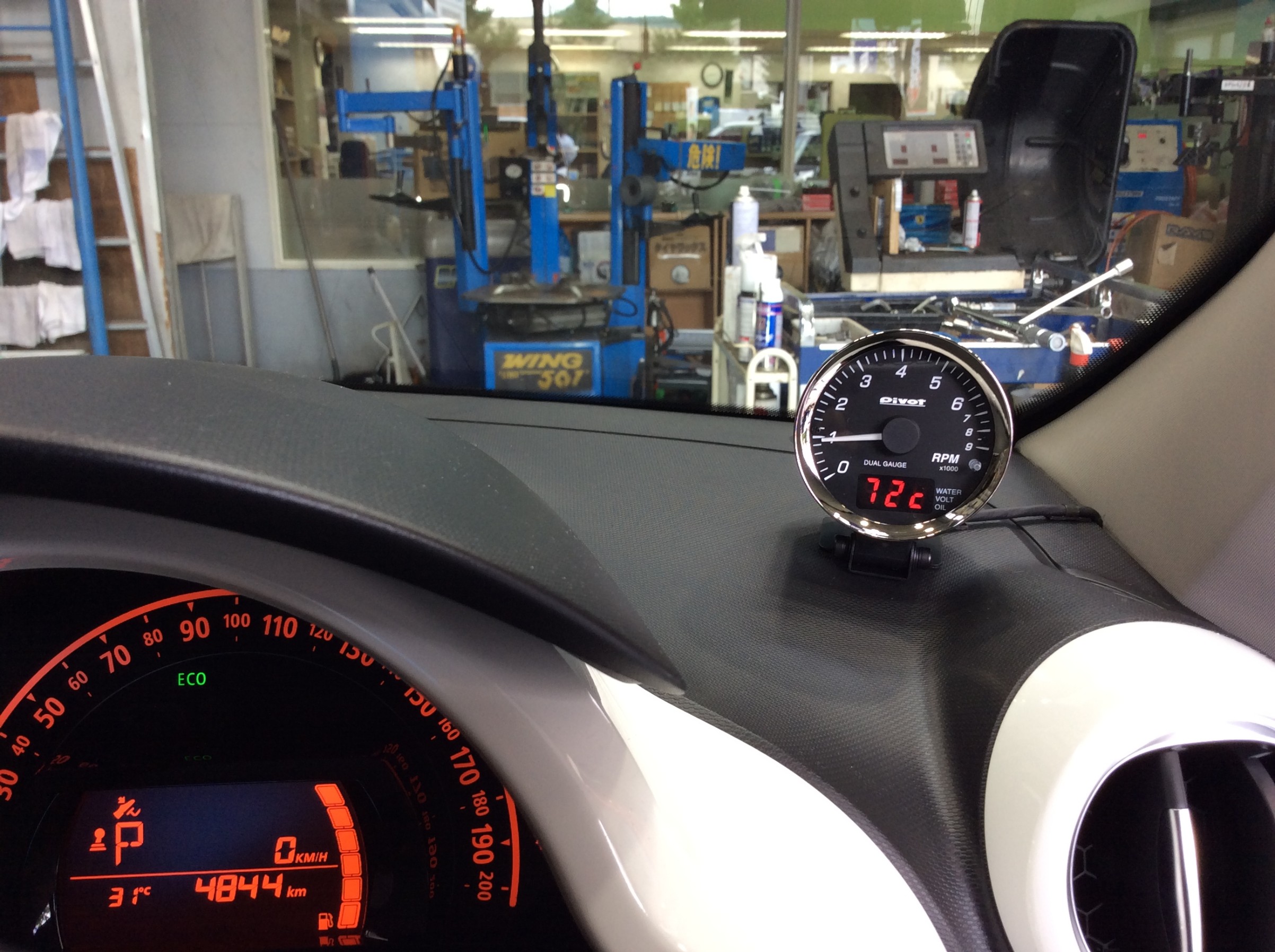 同時にトゥインゴにはタコメーターが無いので、ピボットさんのDUAL GAUDE PRO(DPT)も取付させていただきました。(デュアルゲージにすることにより水温も確認できるように)