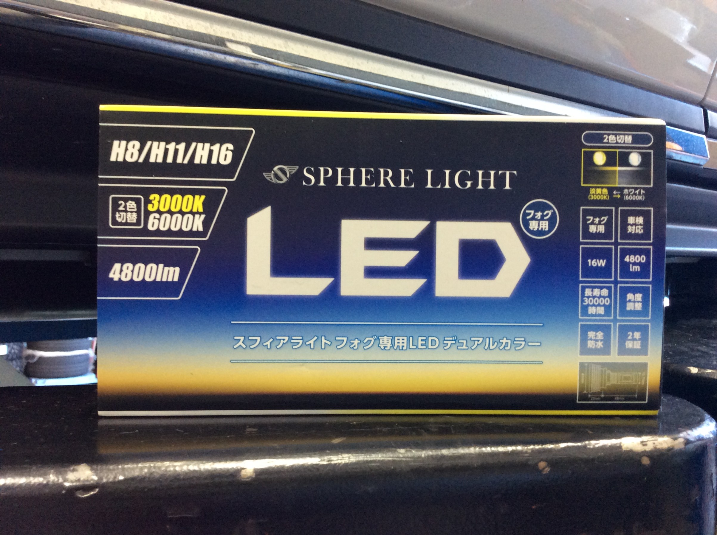 せっかく新たにLED球を購入するのであれば、某メーカーさんの某車種にも純正オプション設定が有るデュアルカラー(ホワイトとイエローの切り替えが可能)が良いとの事なので、今回はスフィアライトさんのデュアルカラーモデルをお選びしました。(ルーメン数が他のメーカーさんより大きかったもので・・・)