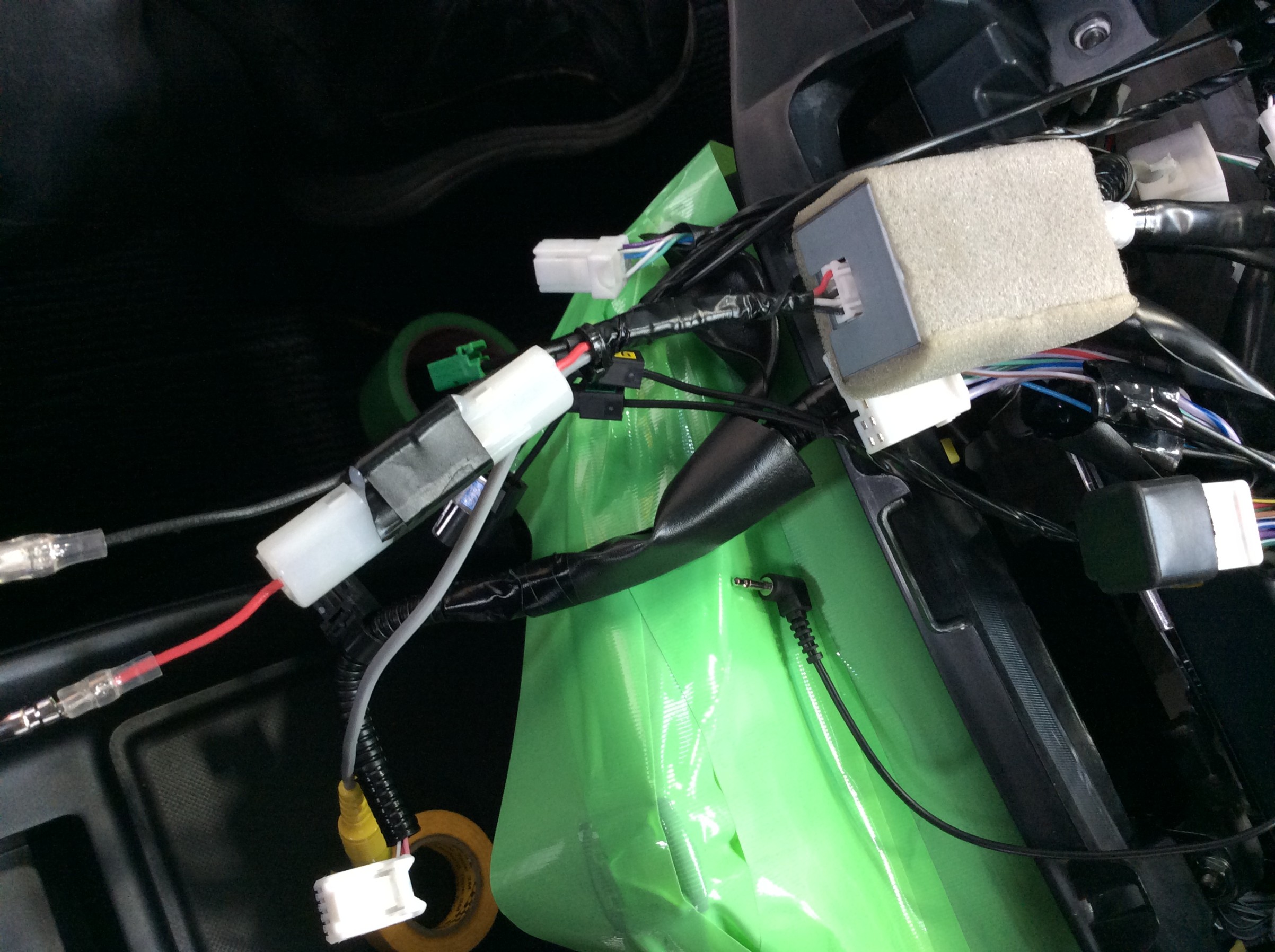 TVのアンテナ線・GPS配線・マイク配線等を本体裏まで通し、最後にはオーディオ裏にてバックカメラの変換配線も接続し