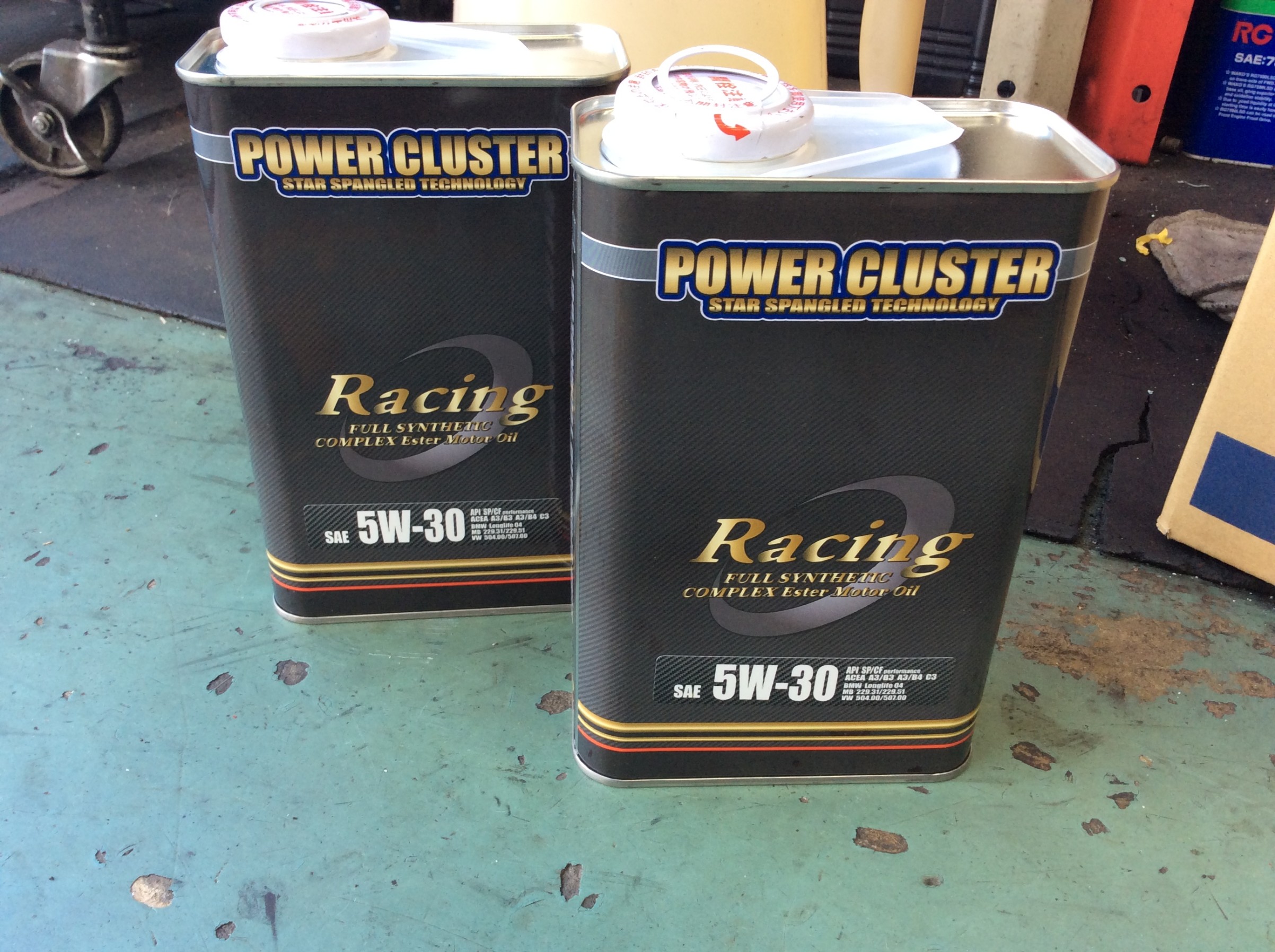 お客様のご指定でいつも入れさせていただいておりますパワークラスターさんのRacingシリーズオイル(粘度は5W-30)です。