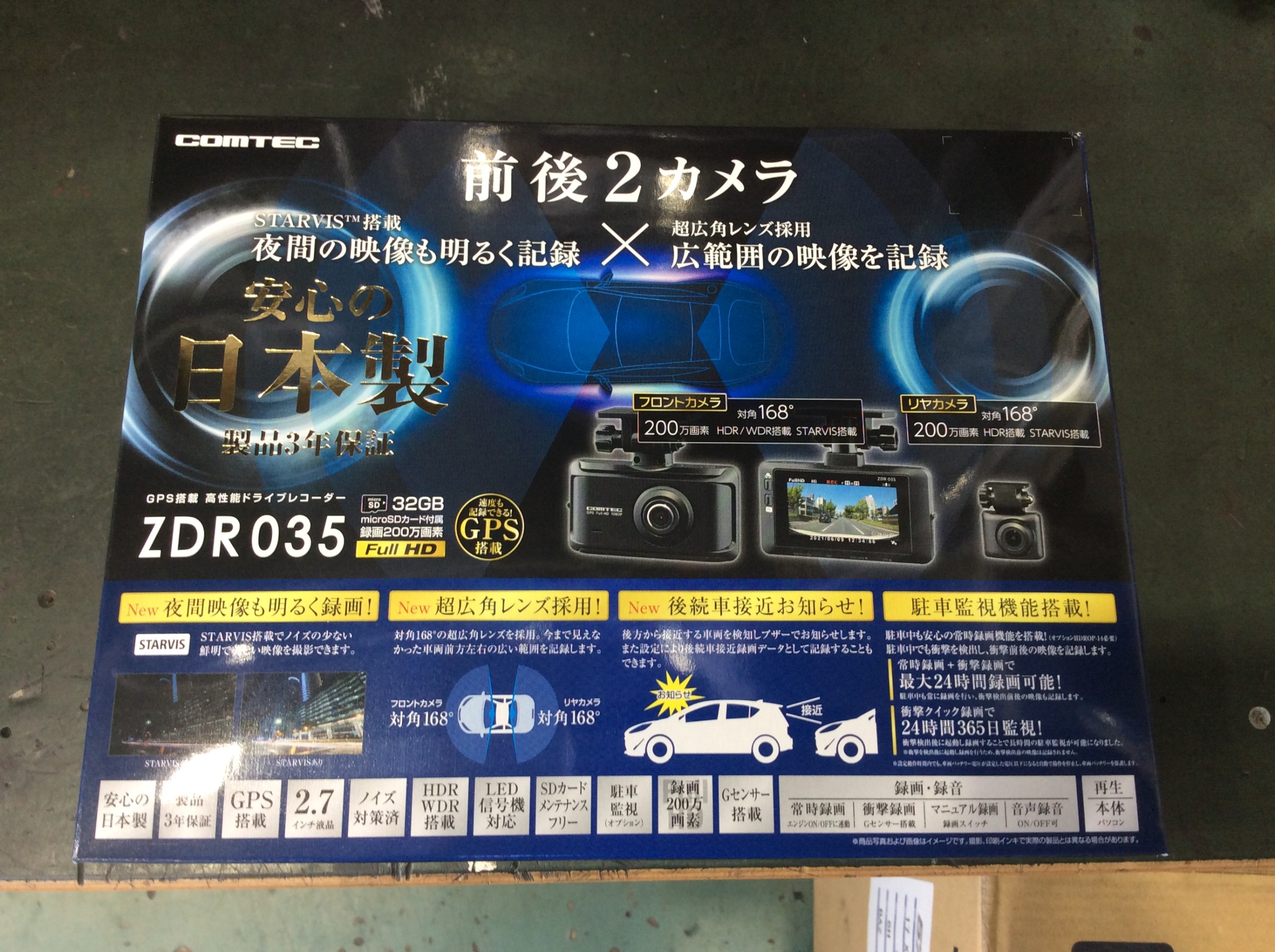 取付させていただいたのは、当店一番人気のコムテックさんの前後2カメラのZDR035です。