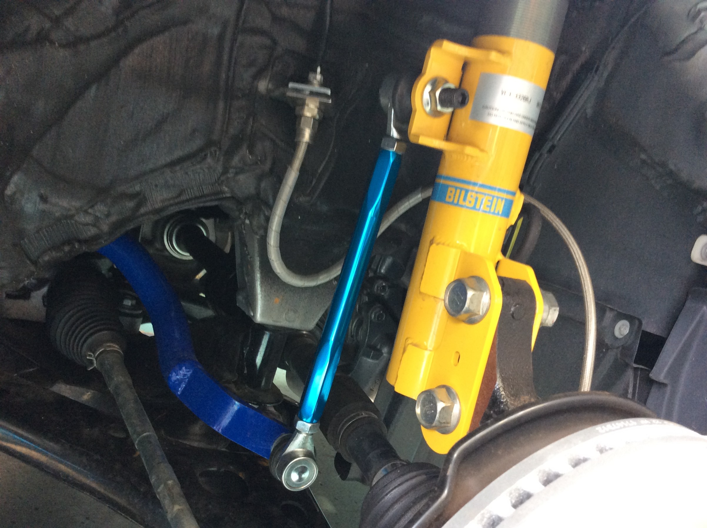 足廻りを交換して車高が下がったという事は、フロントスタビライザーの取付角度がずれてしまったという事なので、クスコさんの調整式スタビリンクに交換して正規の角度・取付位置に戻させていただきました。