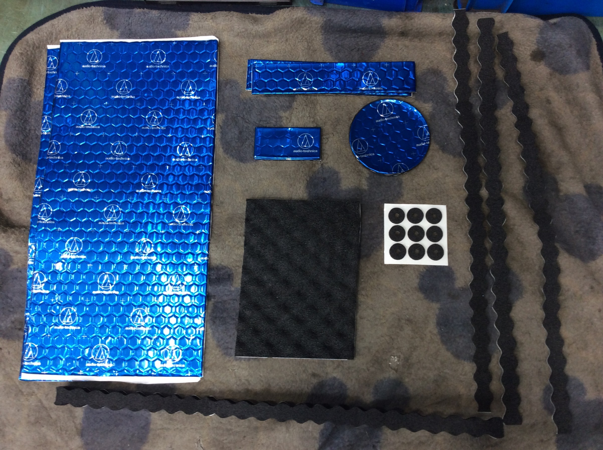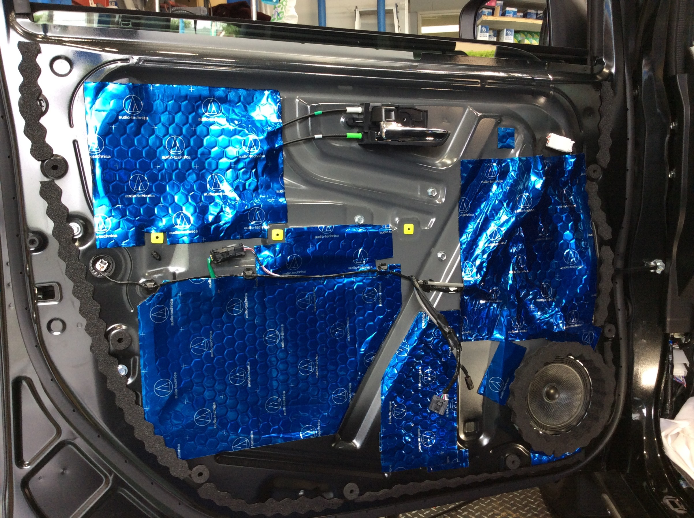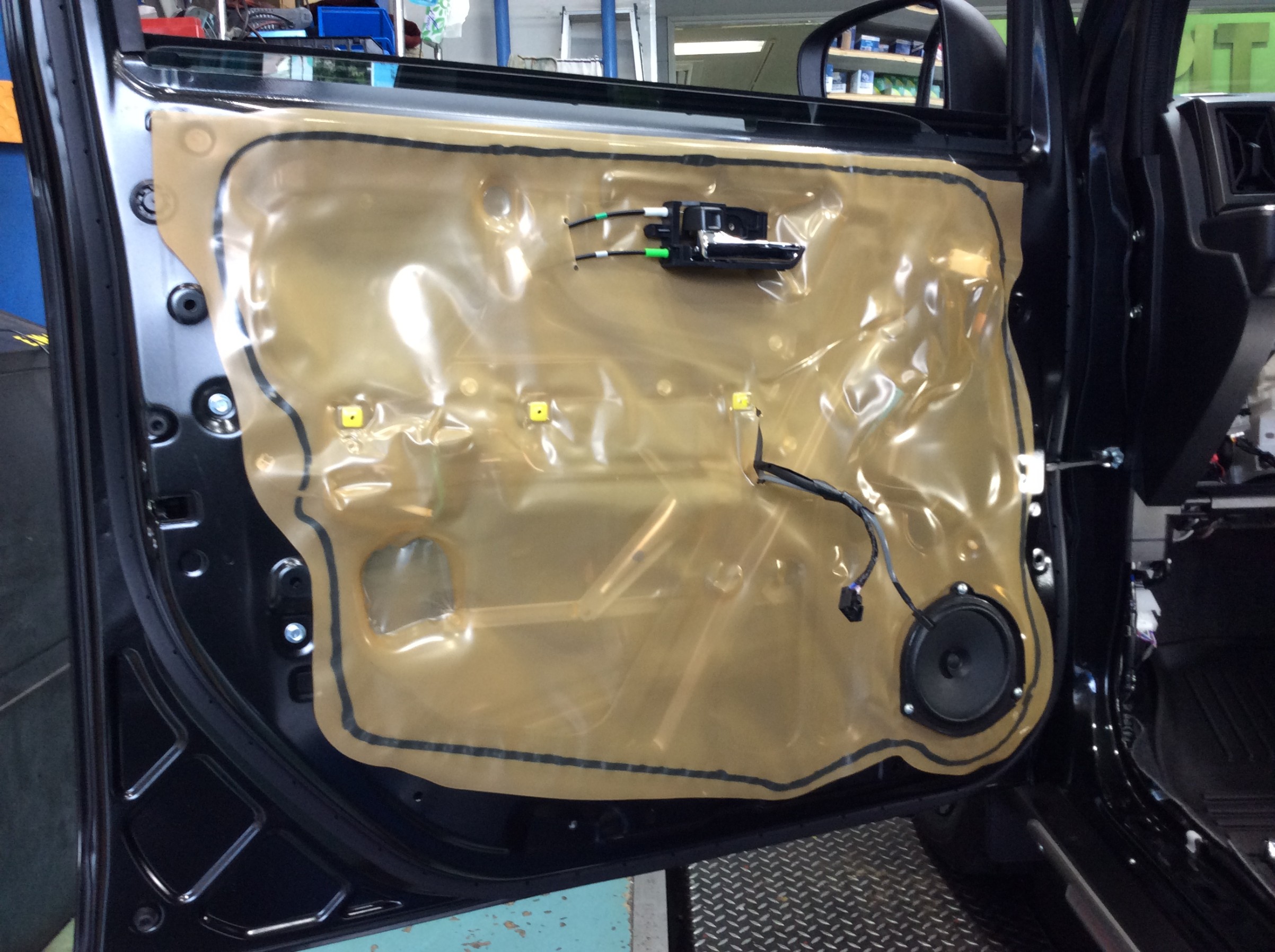 スピーカーを取り付ける前にオーディオテクニカさんのドアチューニングキット「AT-AQ405」を施工いたしました。