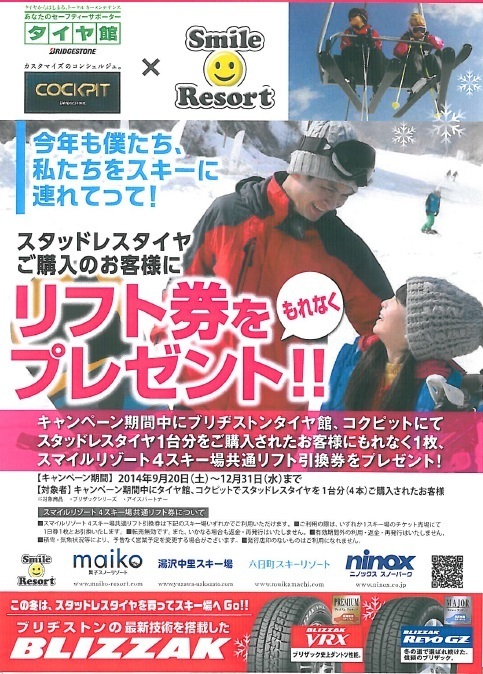 昨シーズン大好評だった、スタッドレスタイヤを買ってスキー場のリフト券プレゼント!