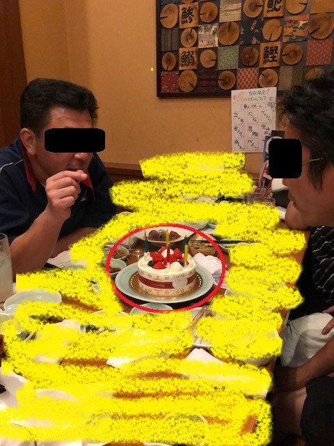 7月誕生日のスタッフが2人いたのでケーキでお祝いです。ちなみにケーキは居酒屋さんに事前に相談、ご許可をいただきまして持込みさせていただきました。ご厚意に感謝ですね(^O^) こちらもテーブルが散らかっているので画像処理ですねw