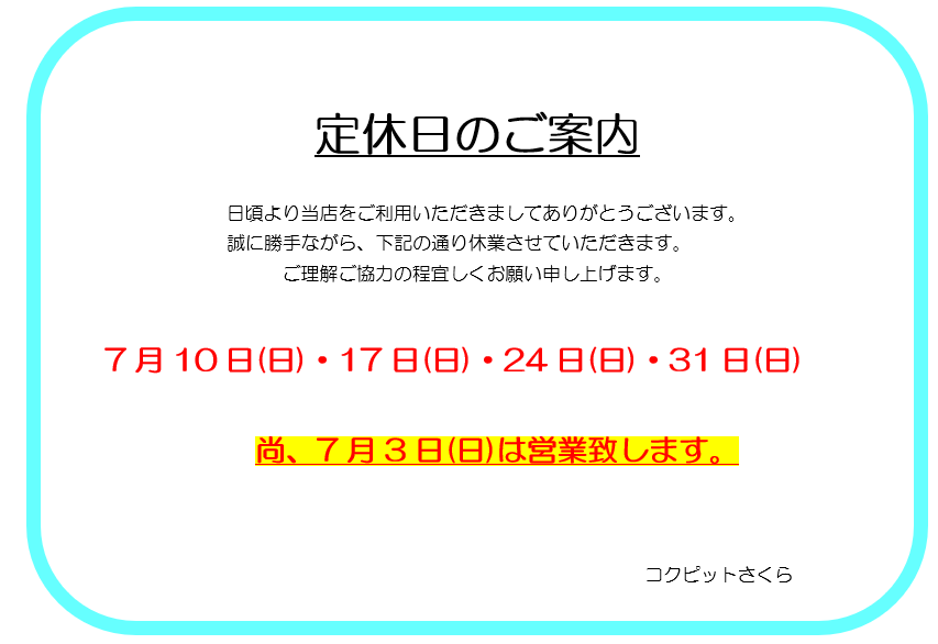 7月は以下の通りお休みさせていただきます。