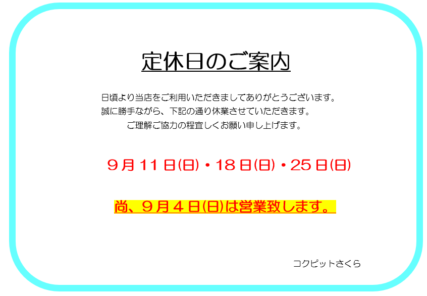 2022年8月29日 ツイート いつも当店をご利用いただきまして、誠にありがとうございます。 昼間はまだまだ暑いですが、夜はだいぶ涼しくなってきましたね。 季節の変わり目は体調を崩しやすいので、ご自愛ください(^^ 9月は以下の通りお休みさせていただきます。 ご不便をお掛け致しますが、何卒ご理解の程宜しくお願い致します。 Prev Next