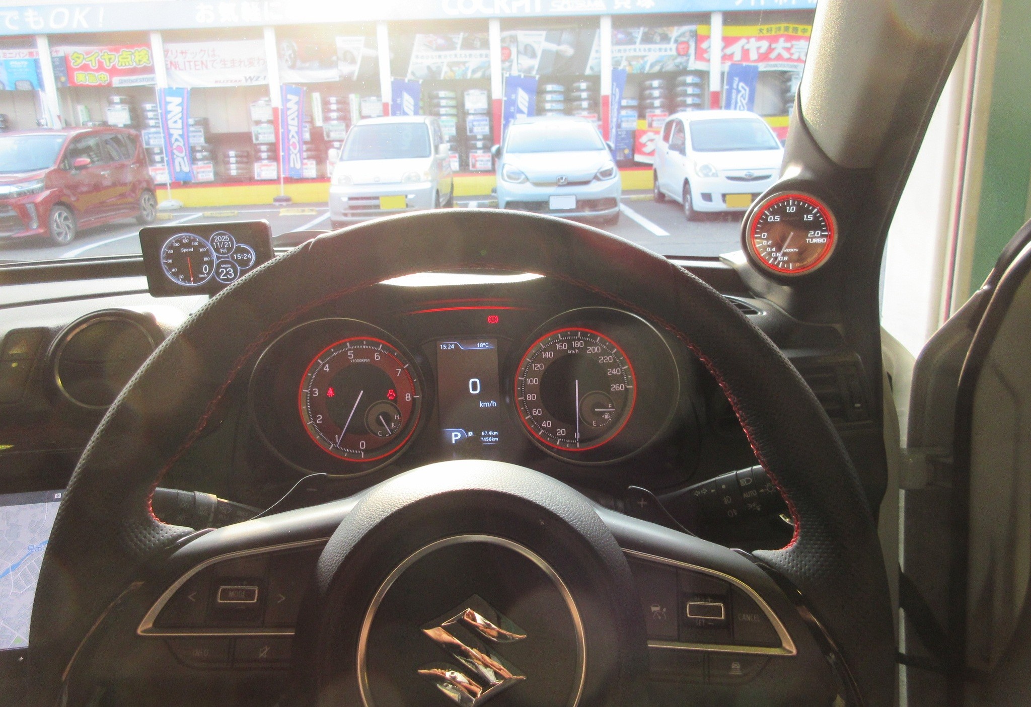 そして追加メーター(ブースト計)とTPMSといった電子パーツで、ターボ系統とタイヤのコンディションチェックを可視化。