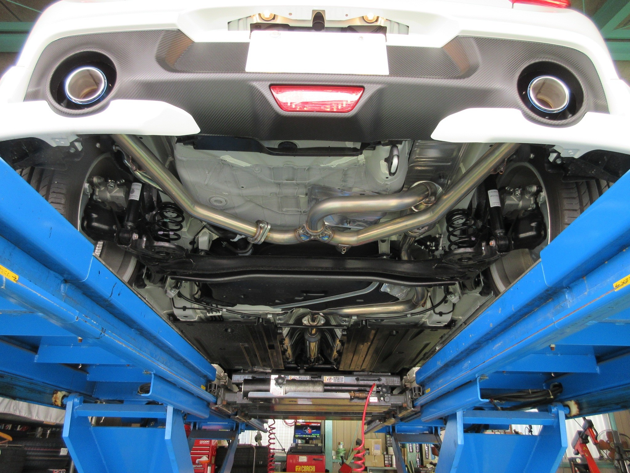 そして何よりリアピースの集合部分からバンパー出口までの取り回しがパイプ長含め、左右でほぼ同じなのでかなりスタイリッシュです。