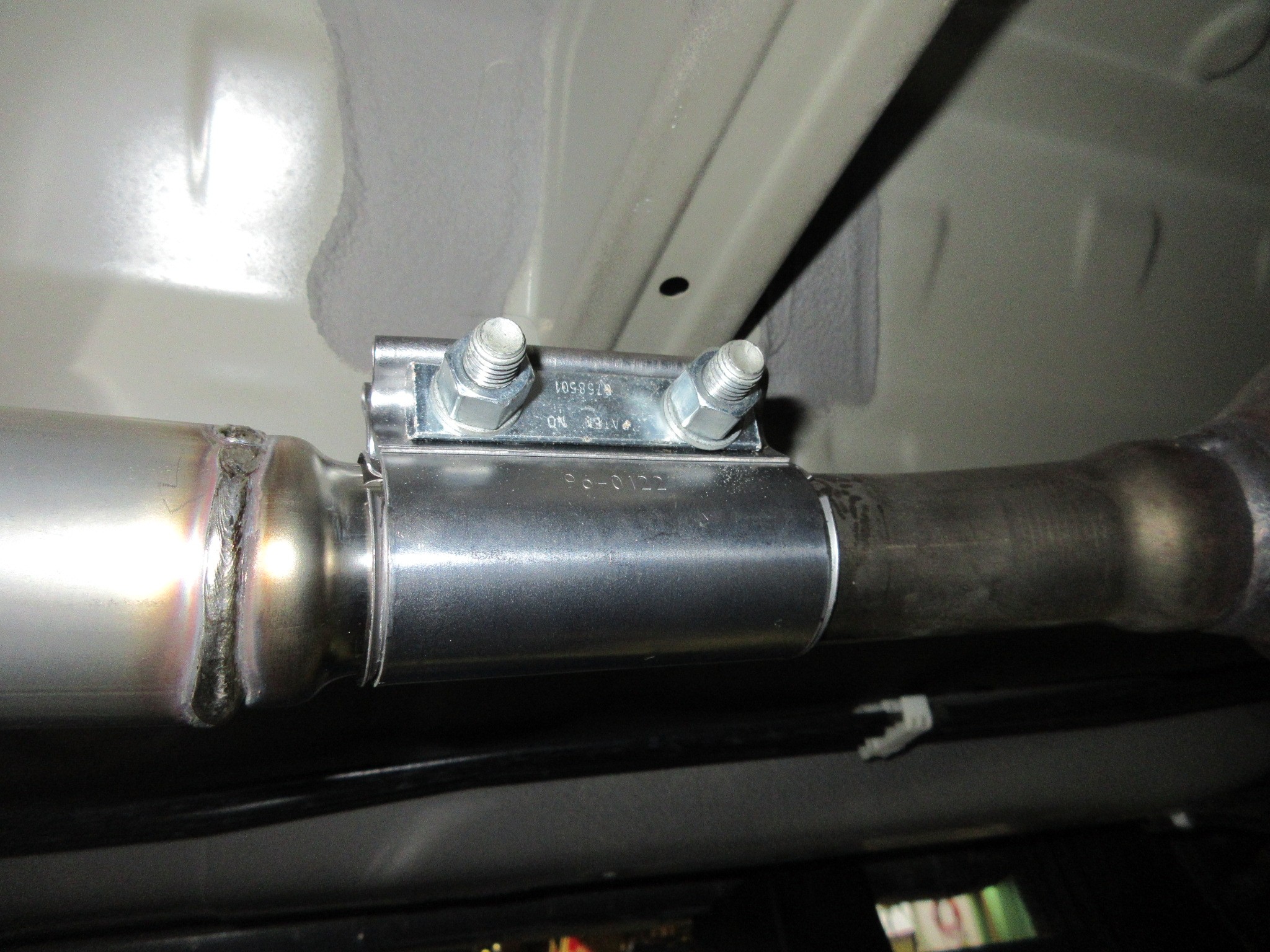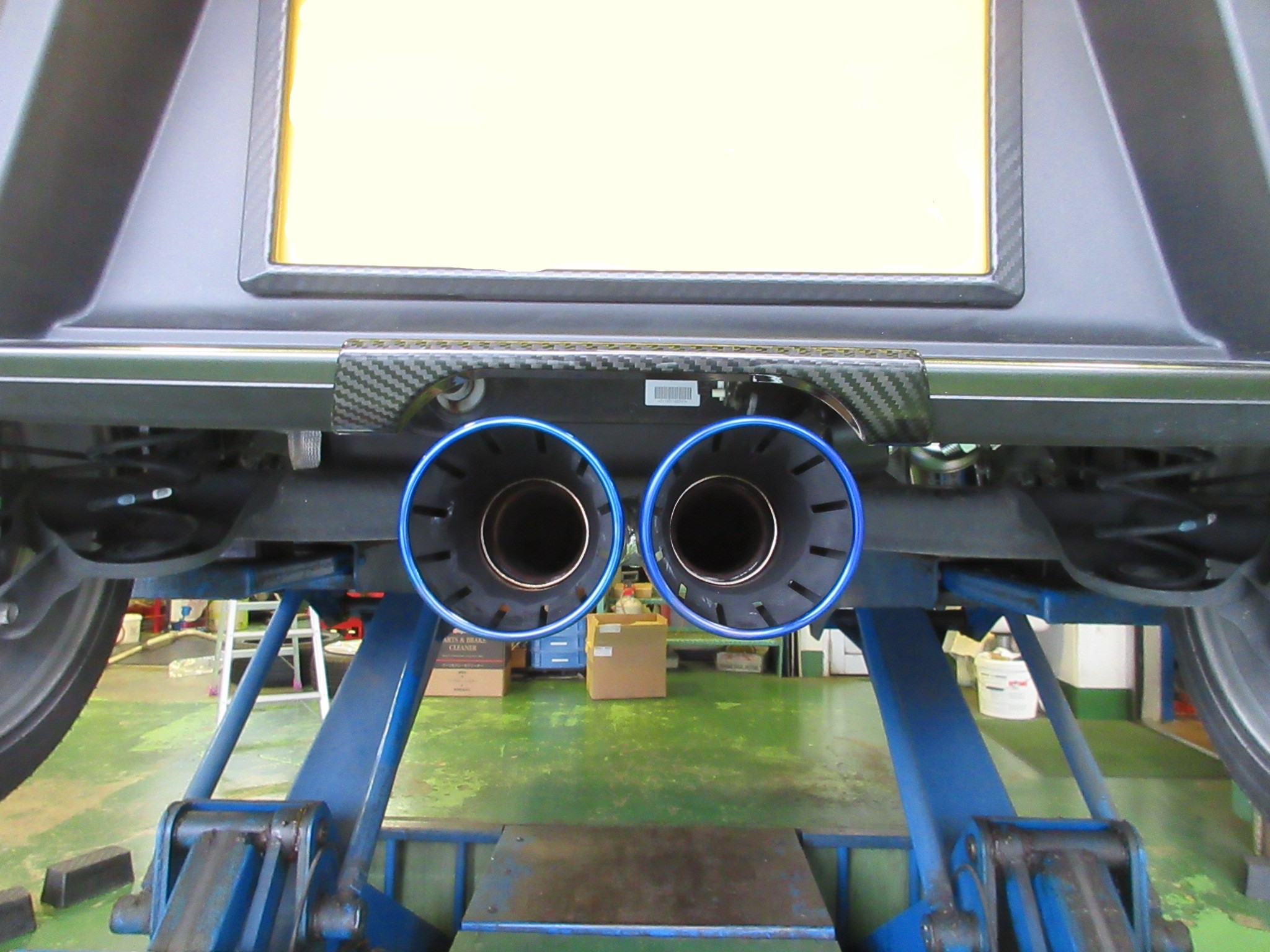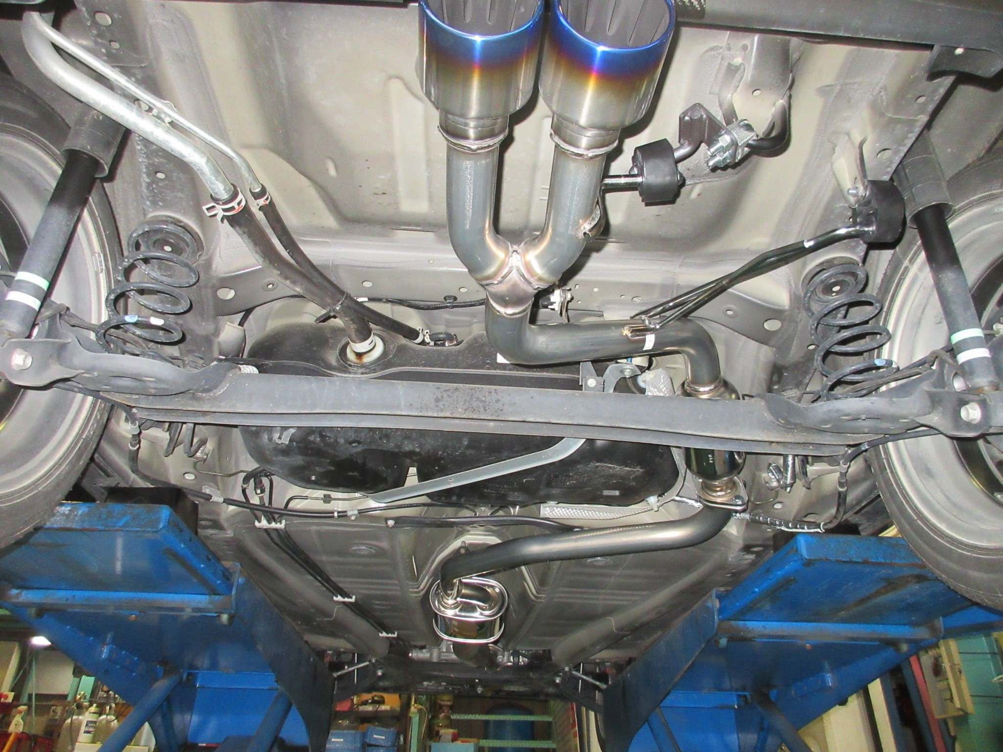 まずはこのお車では見慣れた光景ですが、純正マフラーを切断加工して社外マフラーを継ぐ形です。