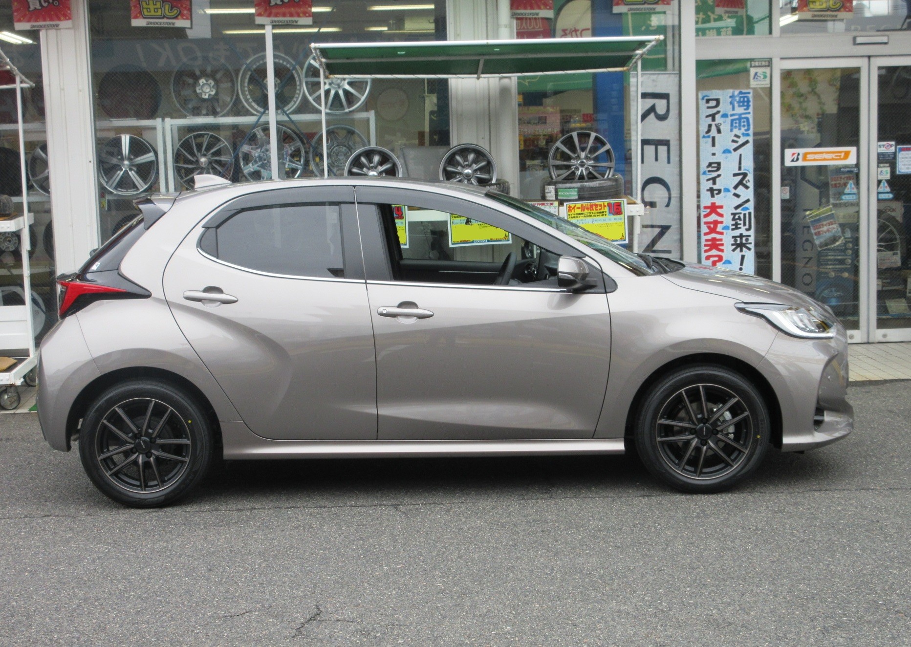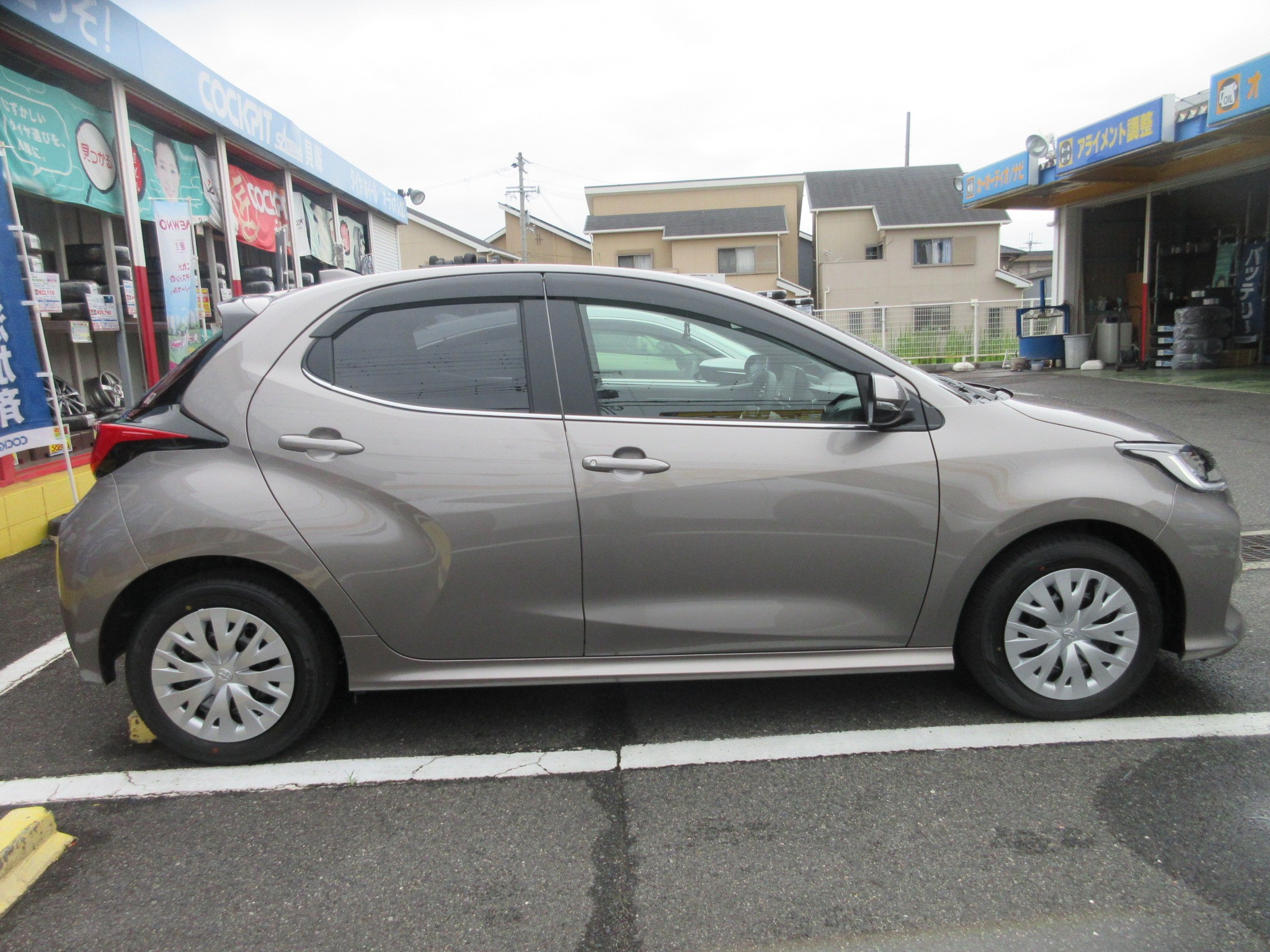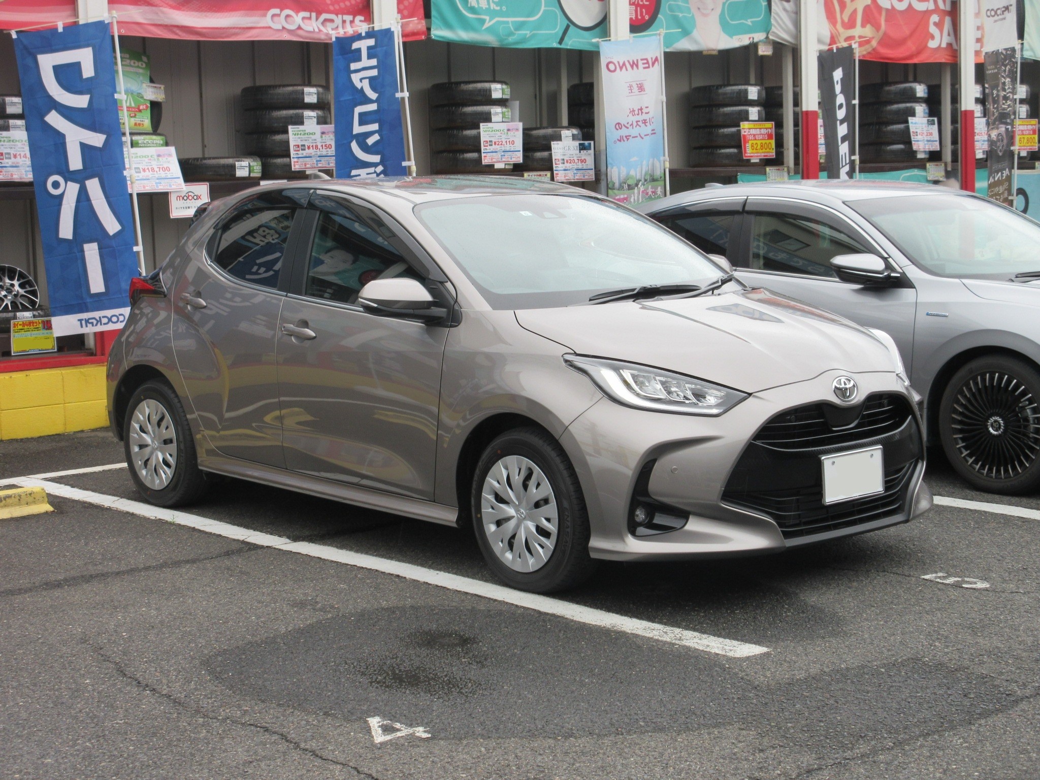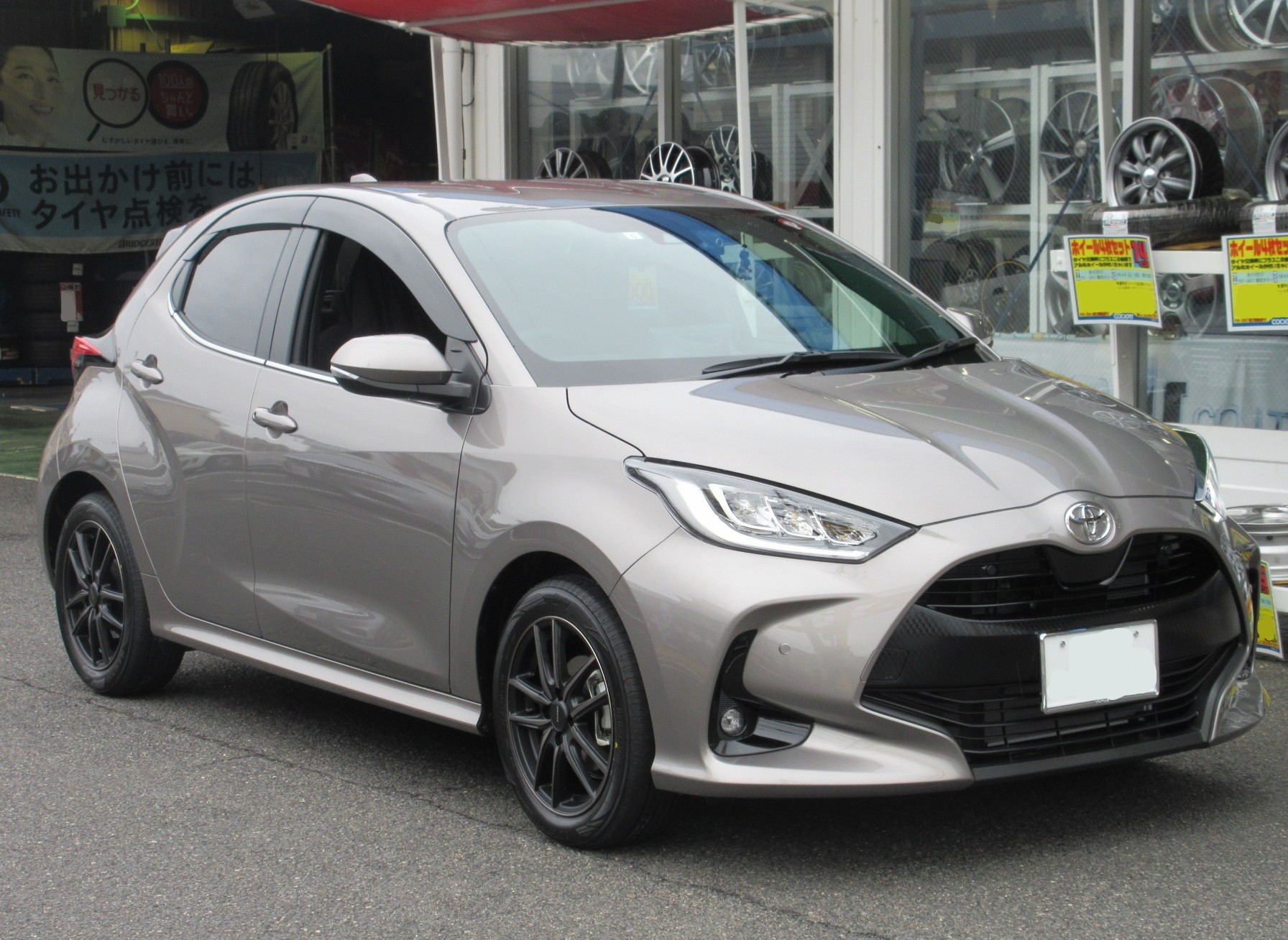 新車納車引き取りにディーラーに向かい、その足で当店に直行されたヤリスのタイヤ・ホイール インチアップ作業です。