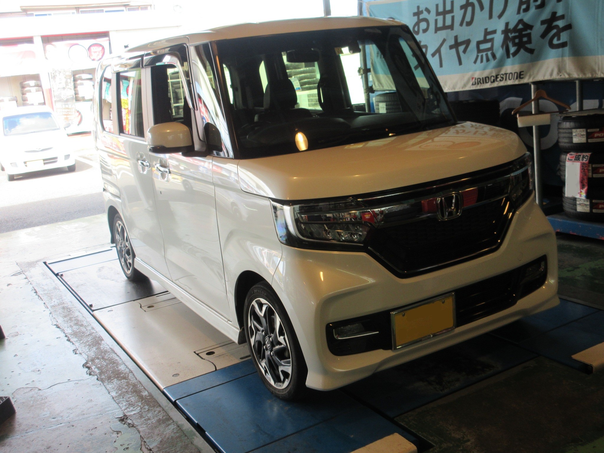 早速PIT INしたN-BOXは外観は綺麗ですが、タイヤは大変な事態に陥ってます。