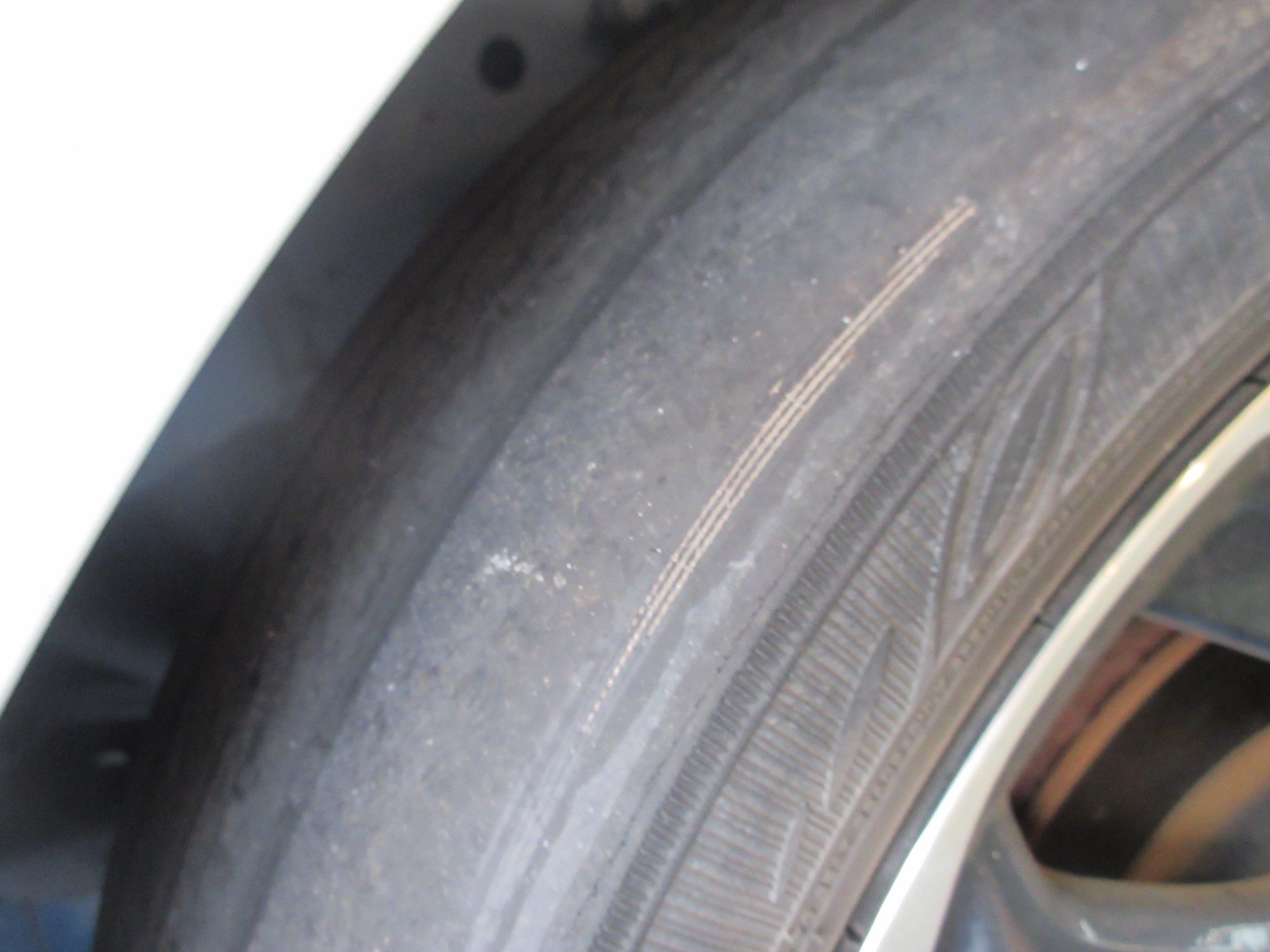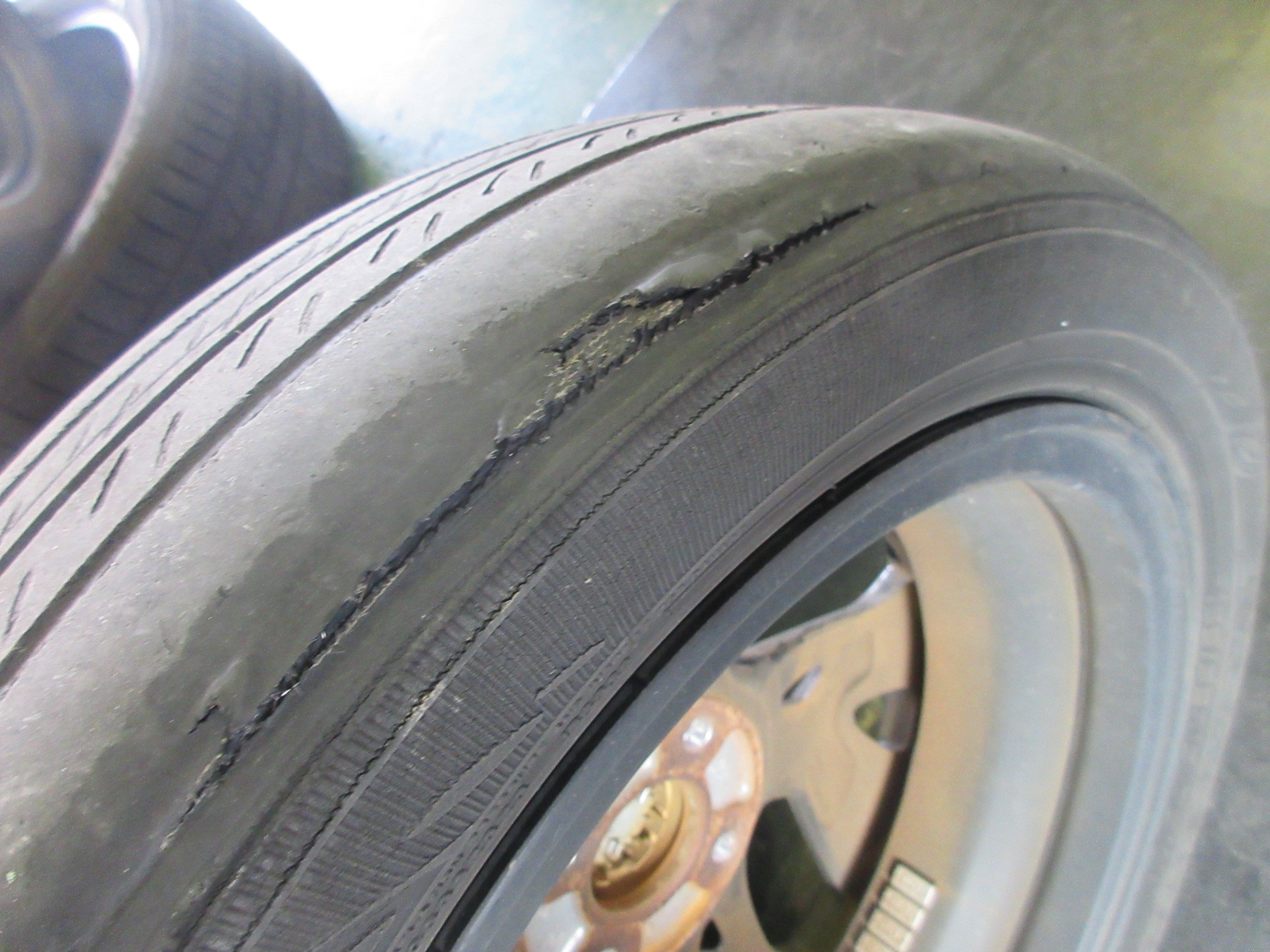 駐車場で内側を覗き込んだり触診しただけでは分からなかったので、丁度地面に接地していた部分だと思いますが、摩耗ではなく裂傷になってしまってます。