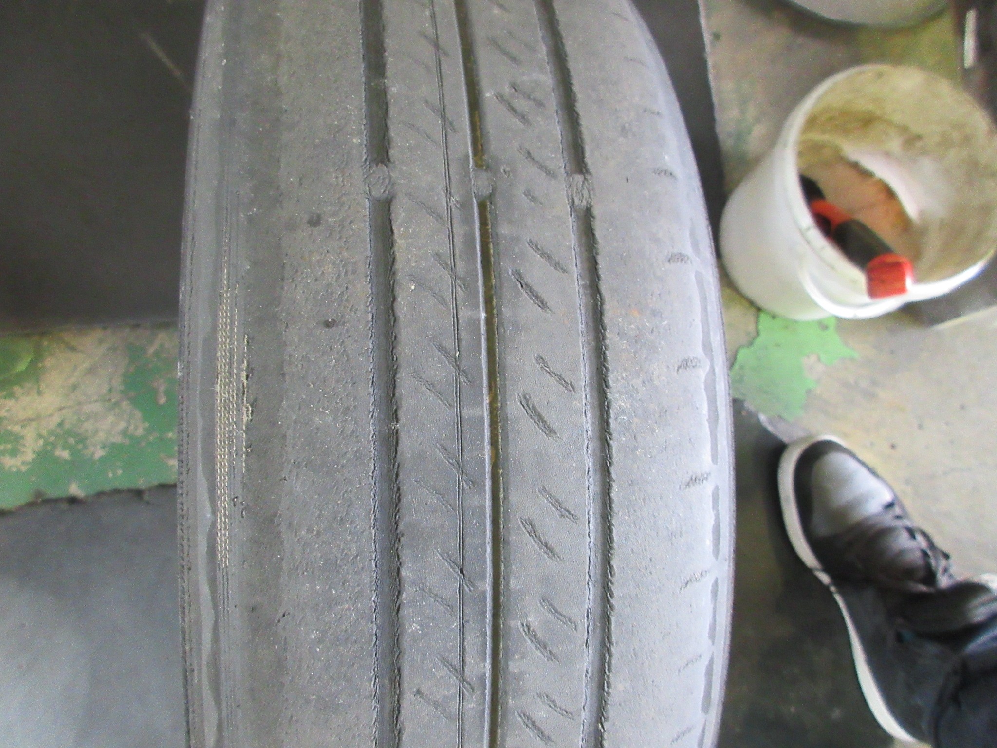 タイヤ交換が終わった段階で、元々の内側裂け状態からかなり改善されてますが、異常摩耗の原因を探るべくアライメント調整に進みます。