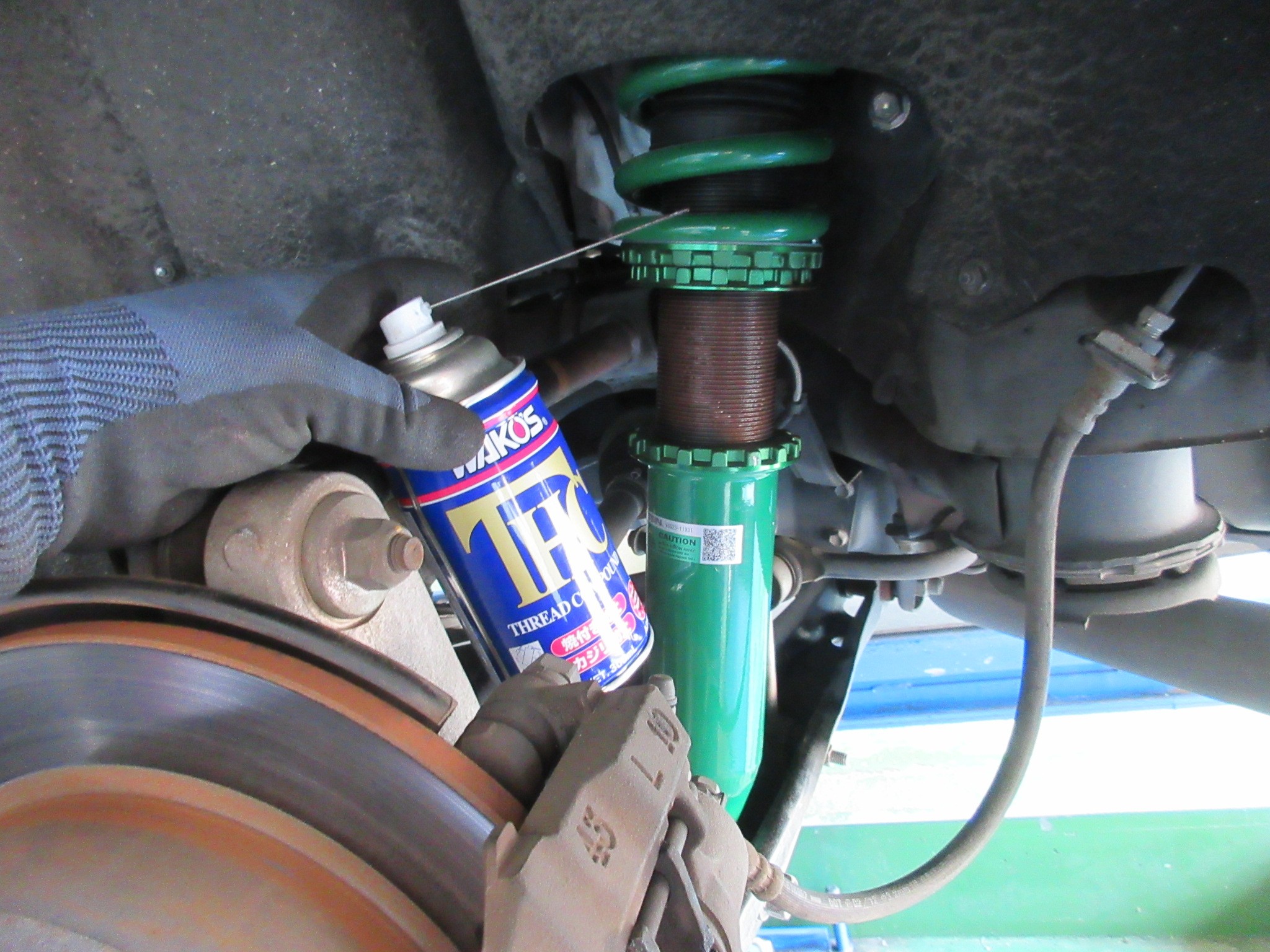 交換が完了したら車高を調整して、TEINのメーカーサイドでも固着防止の処理はしていますが、念の為にネジ部にスレッドコンパウンドで固着やカジリを防止しておきます。
