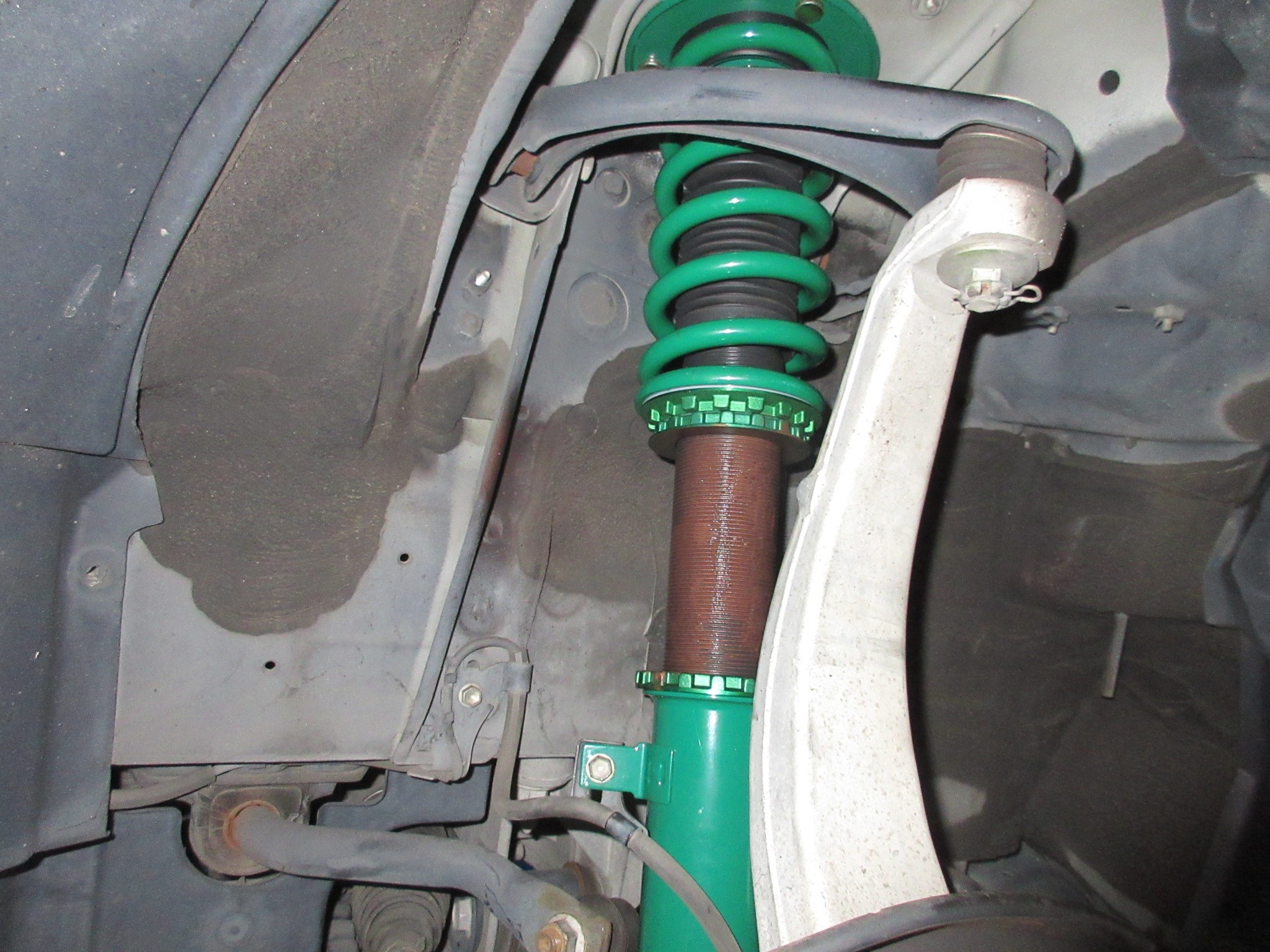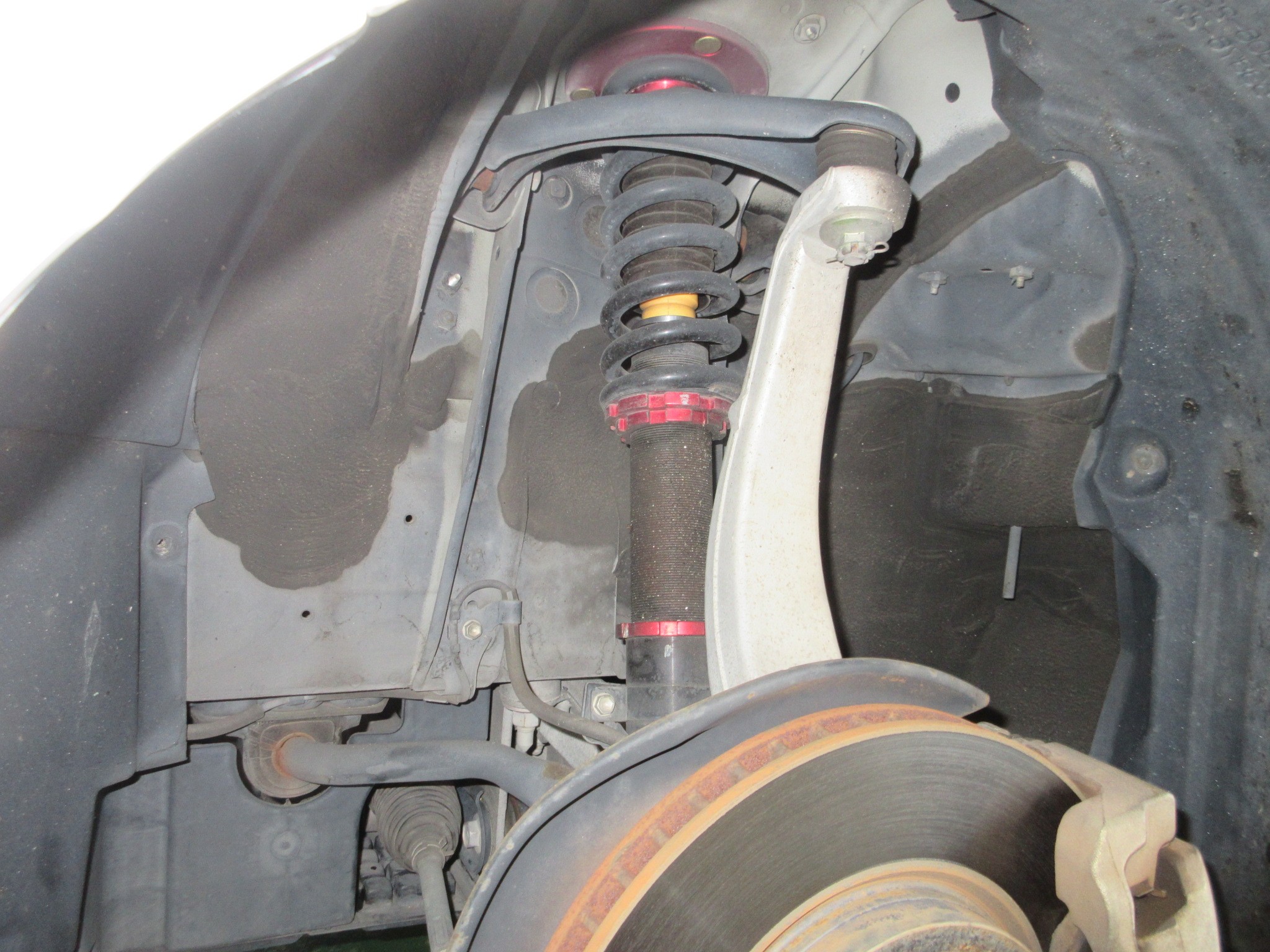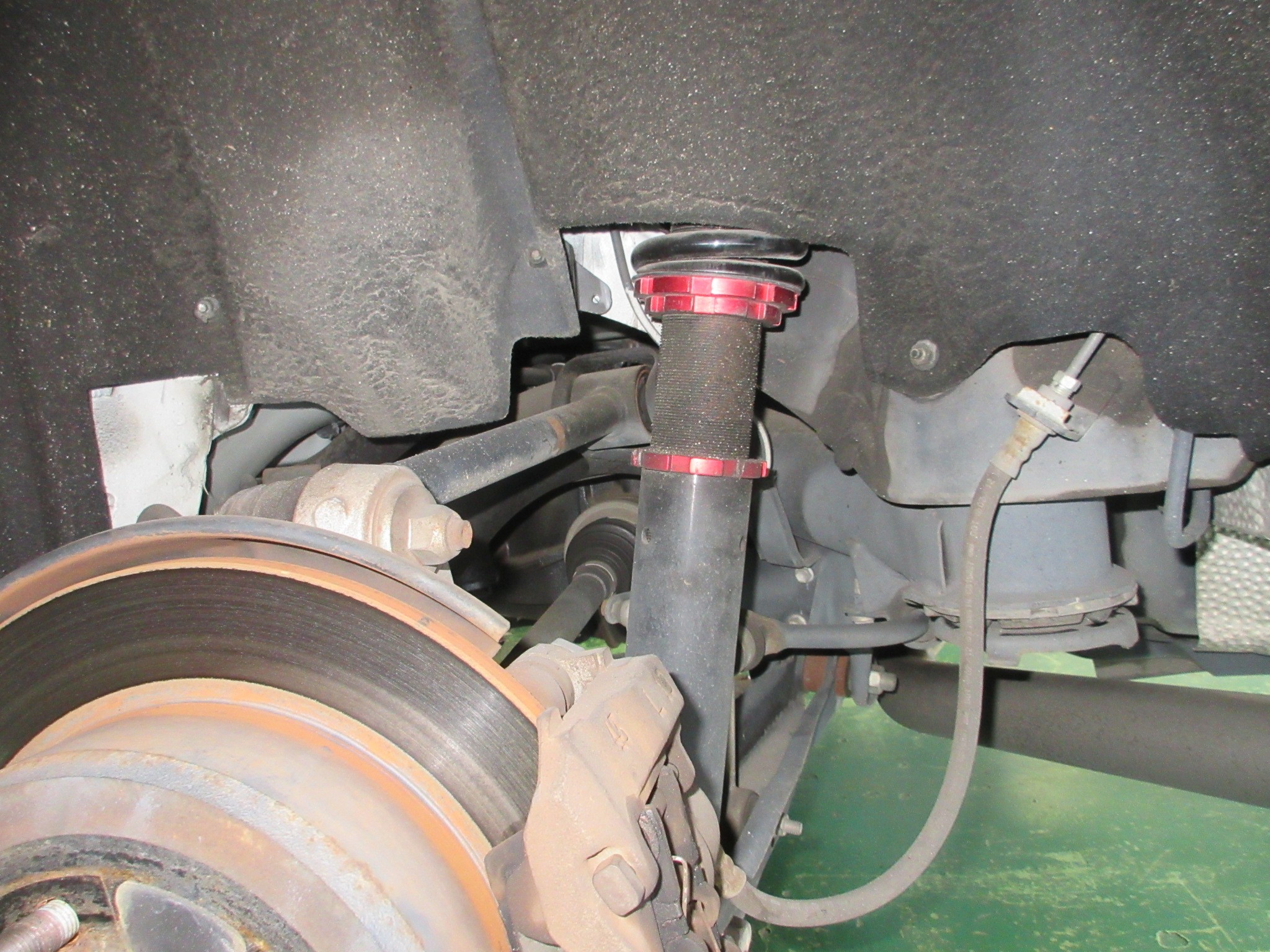 という事で、まずはこのあらゆる面での詳細が不明な車高調を取り外し、用意した物に交換していきます。