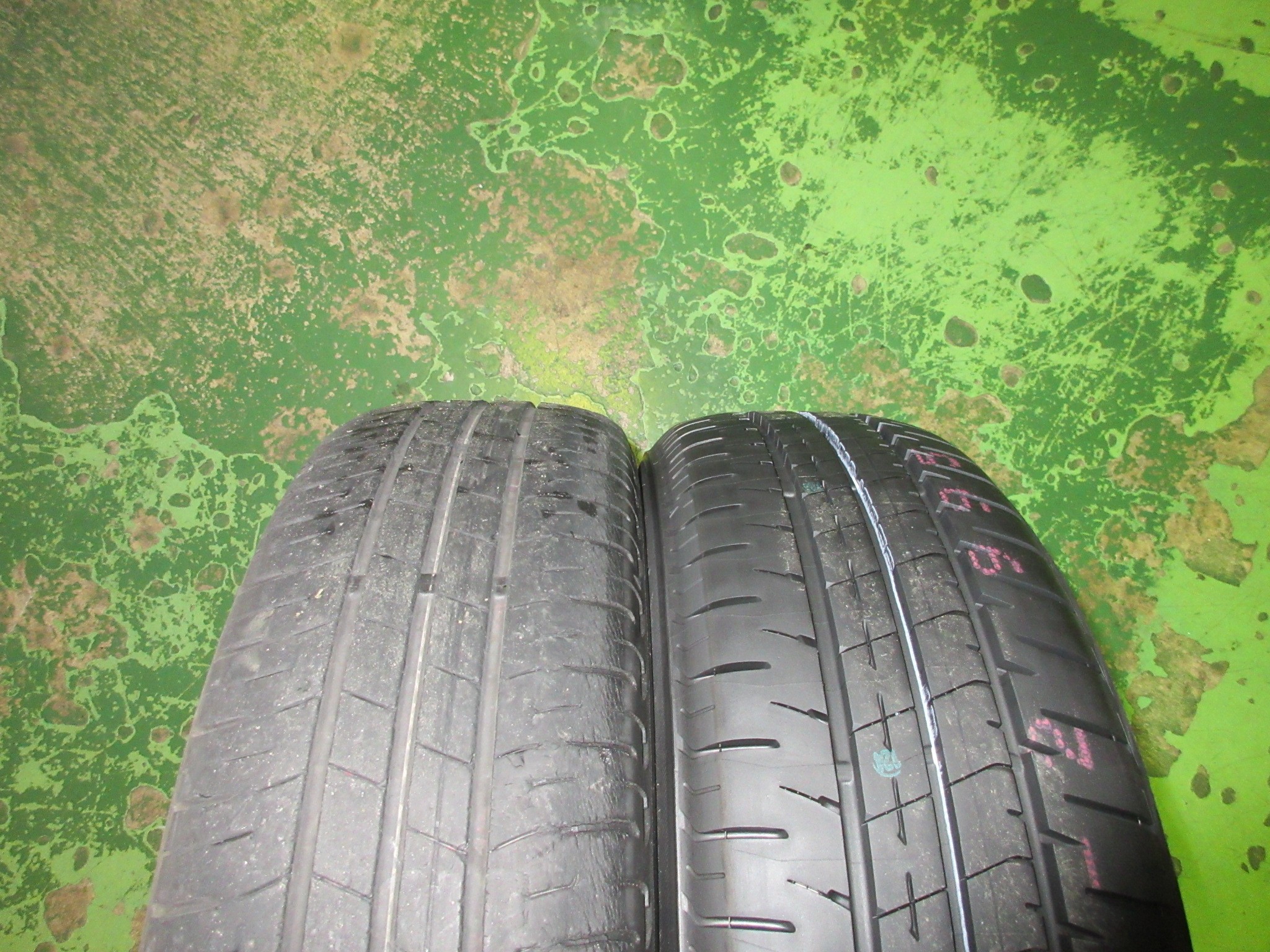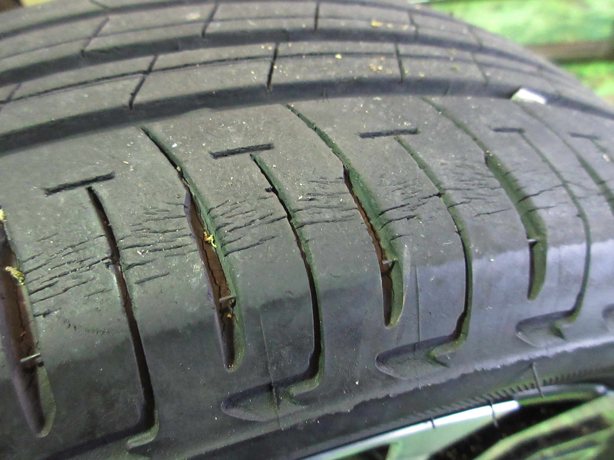 主溝は十分残っていますが、ショルダー部はかなりのヒビ、そして空気圧不足の様な偏摩耗症状も出ています。