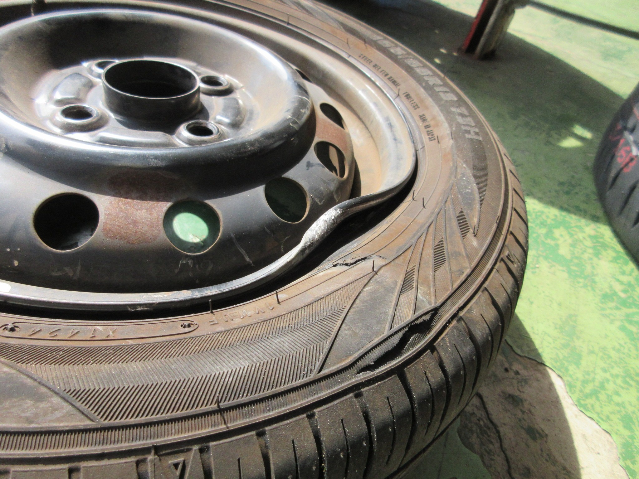 タイヤはサイドがザックリと裂けてますし、ホイールはグニャっと曲がってます。