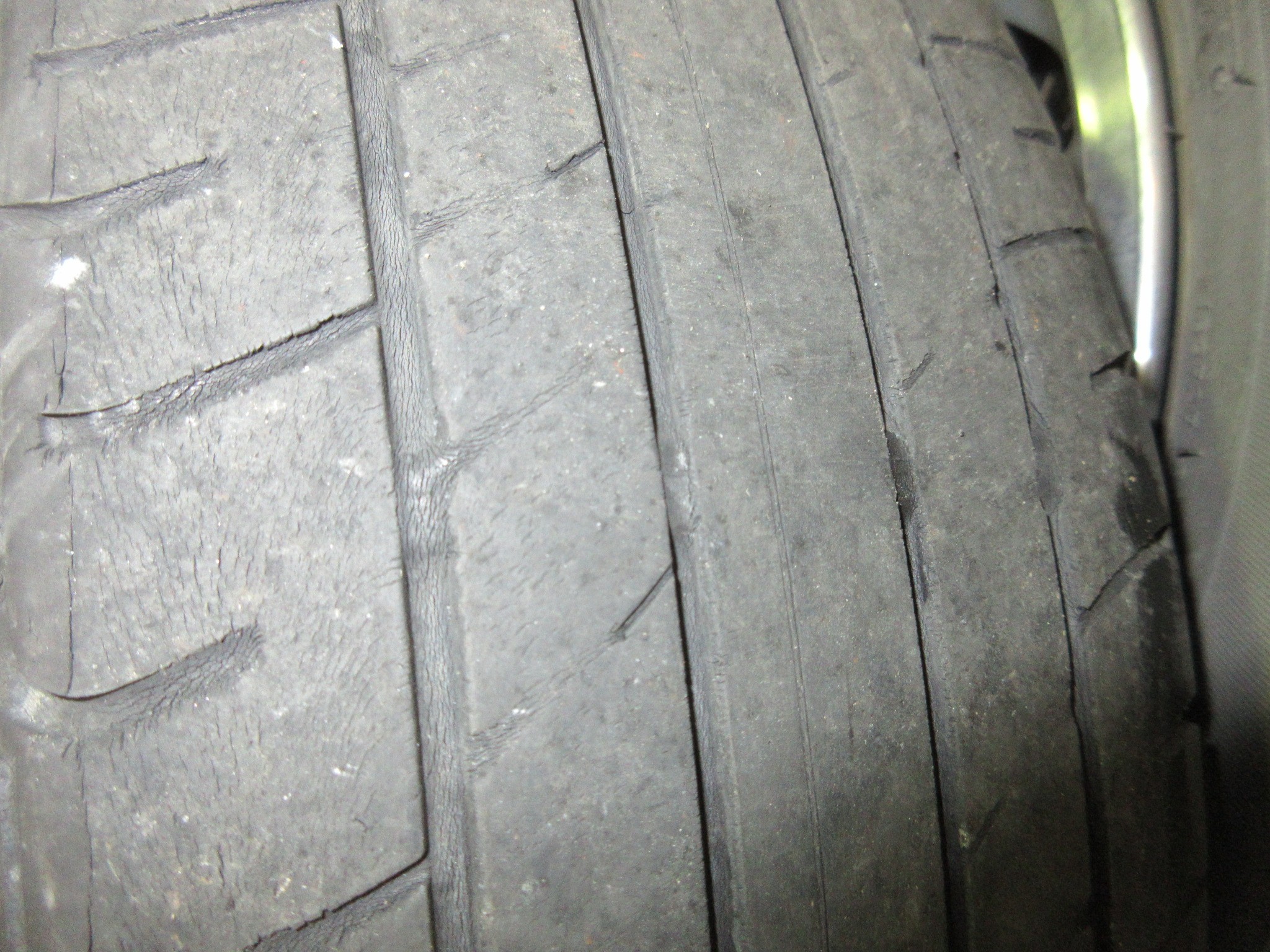 まずは擦り減ったタイヤですが、一部スリップサインまで摩耗している箇所がありますので、摩耗限度をオーバーしていますねw