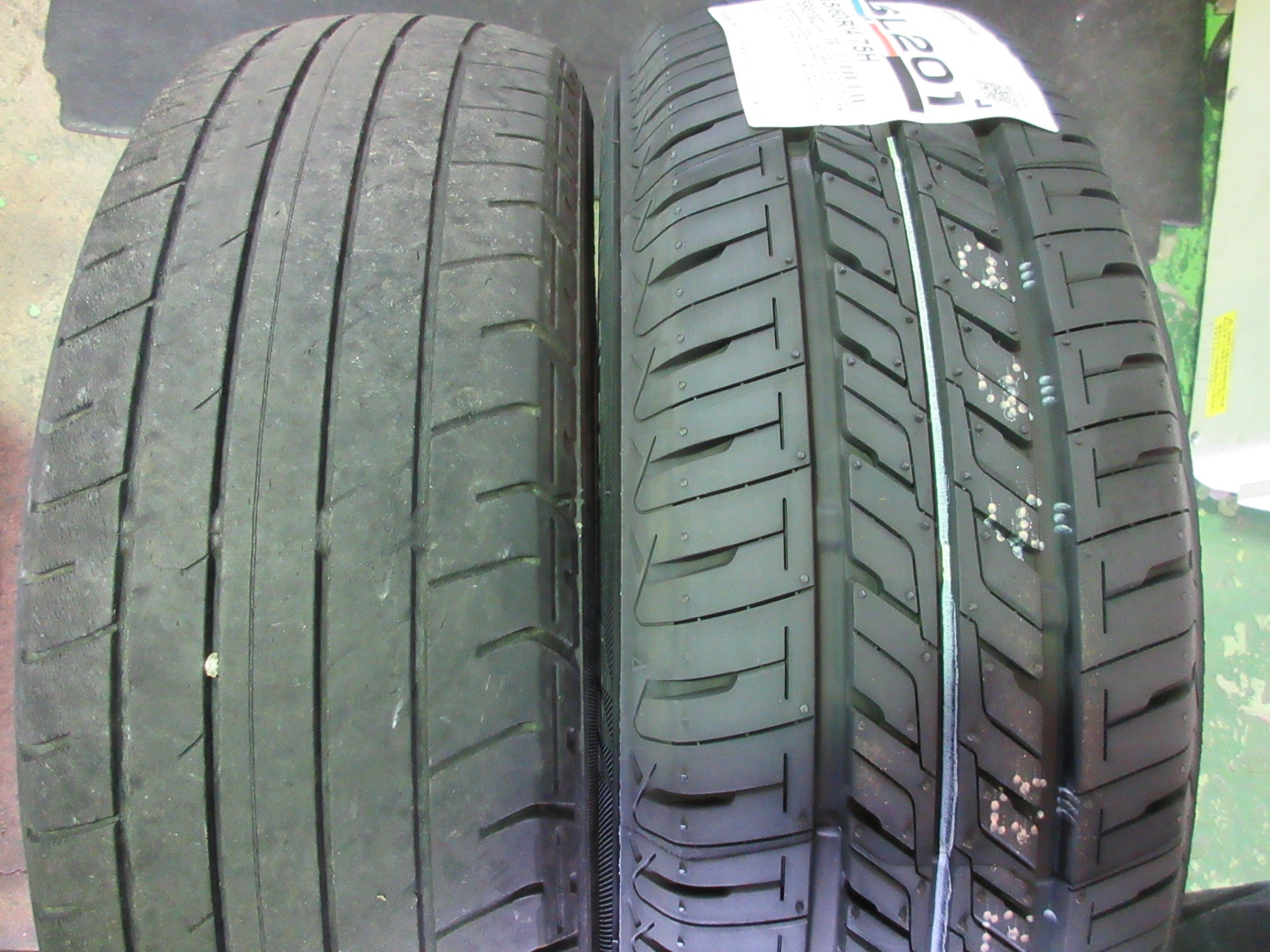 新品と外したタイヤを並べて比べると、溝のパタンは違いますが、外したタイヤは擦り減りすぎていたという事が良くわかりますね。