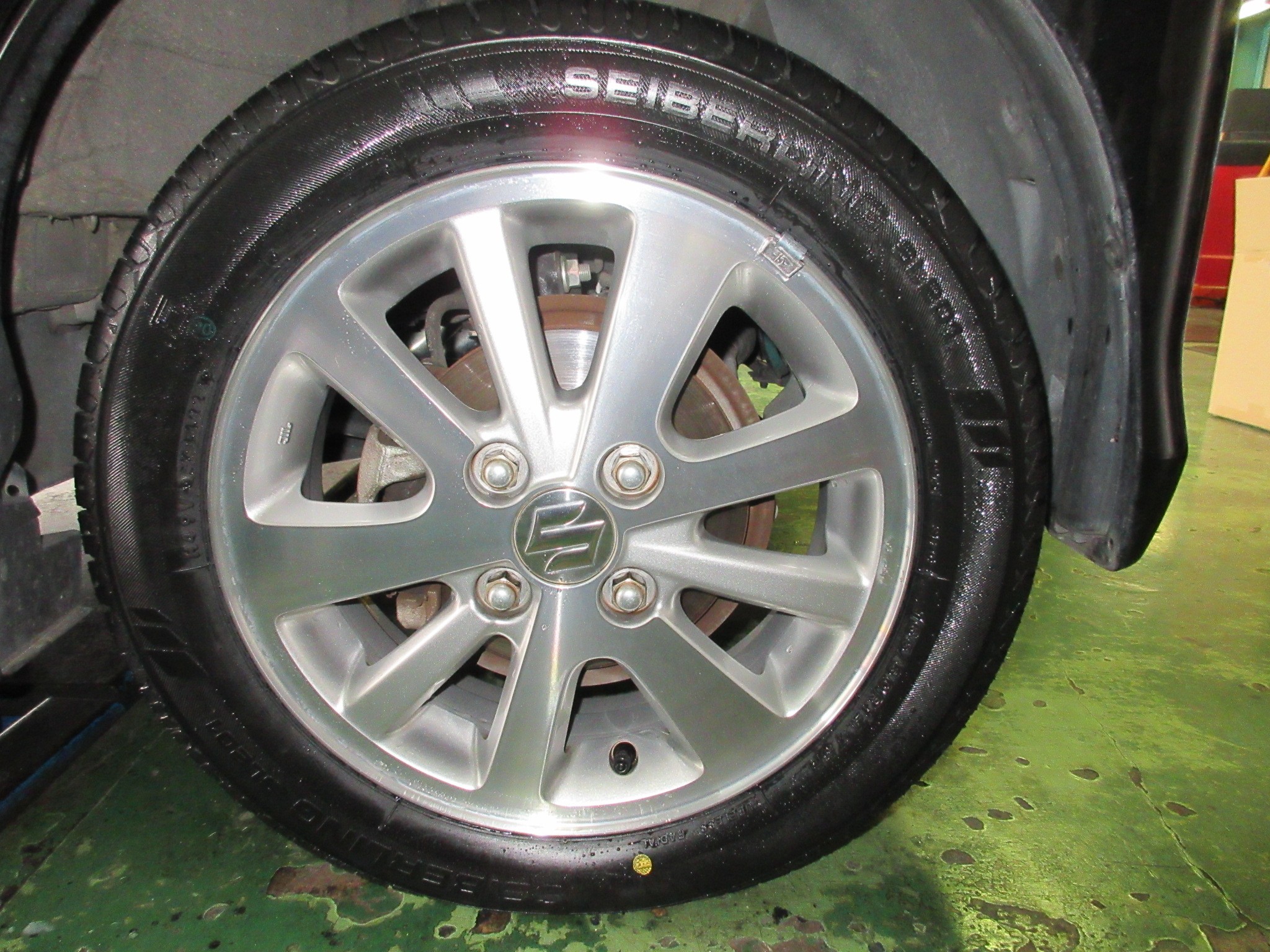 そんな著しく消耗したタイヤを新品タイヤに交換してホイールバランス調整後、ホイールを洗ったり、リムからのエア漏れがないか等のチェックをしたら、最後にお車に取り付けます。