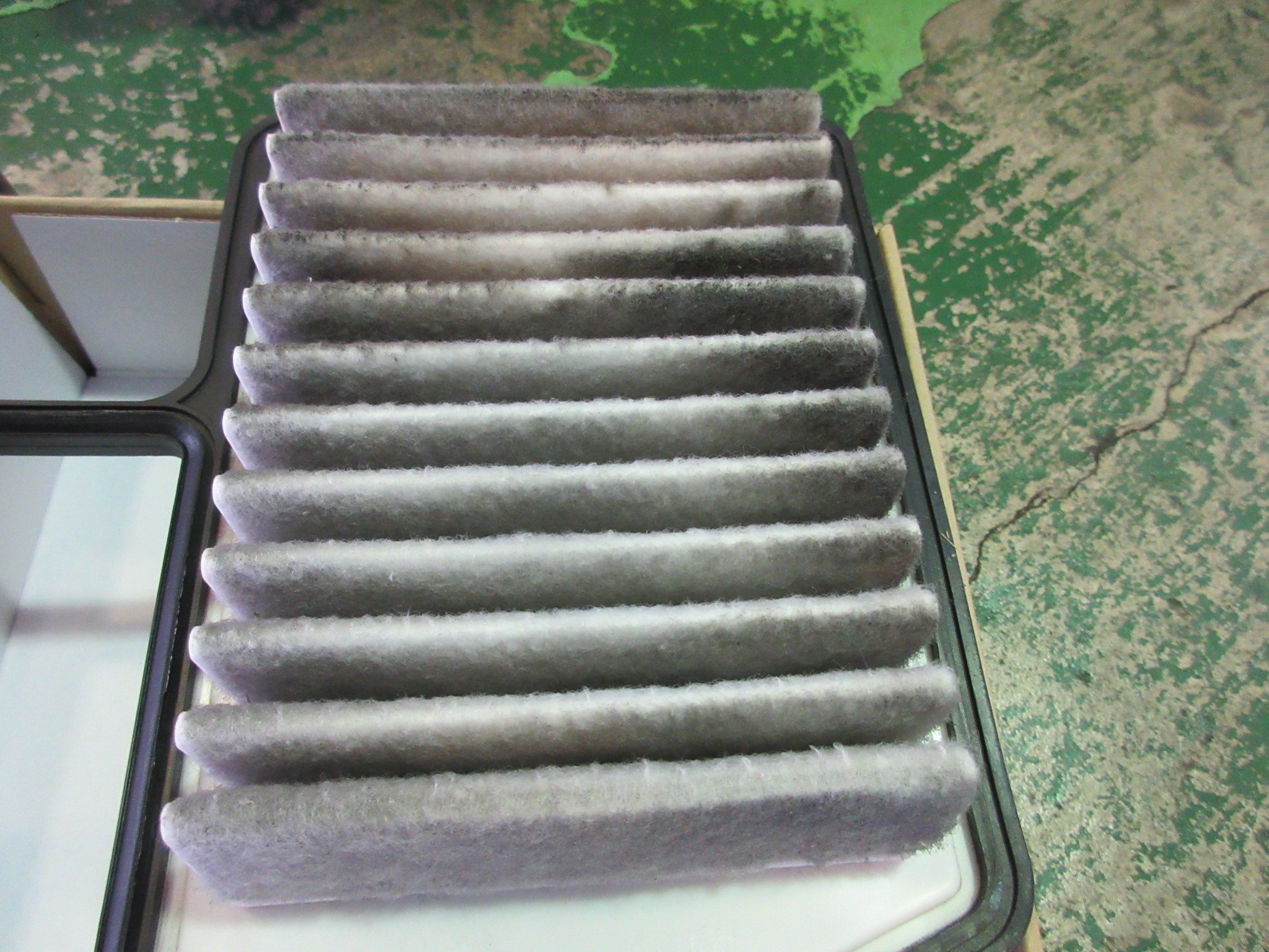 外したエアーフィルターを見ると、もっと早めの交換でも良かったかなぁという気がしないでもないくらい、真っ黒に汚れてました。