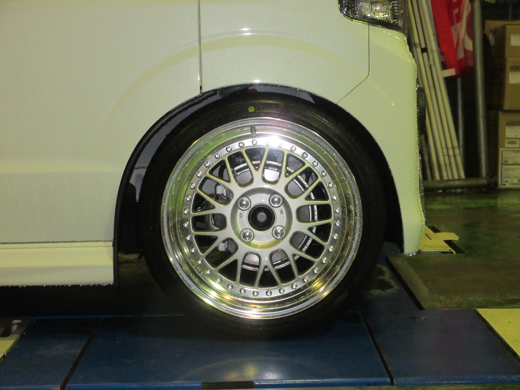 ホイールはシンプル且つ王道のメッシュディスクにピアスボルト付きの深リムデザイン、『WORK MEISTER M1』を取り付けます。