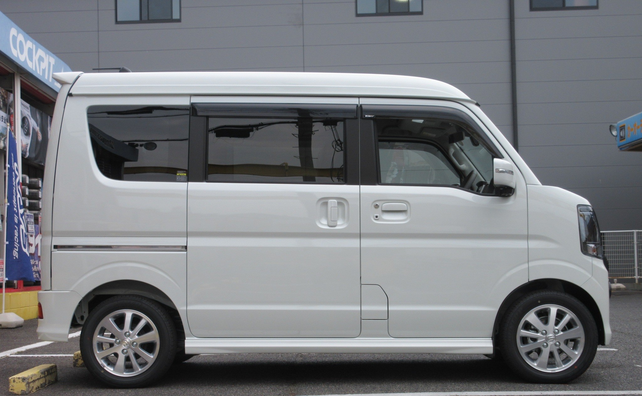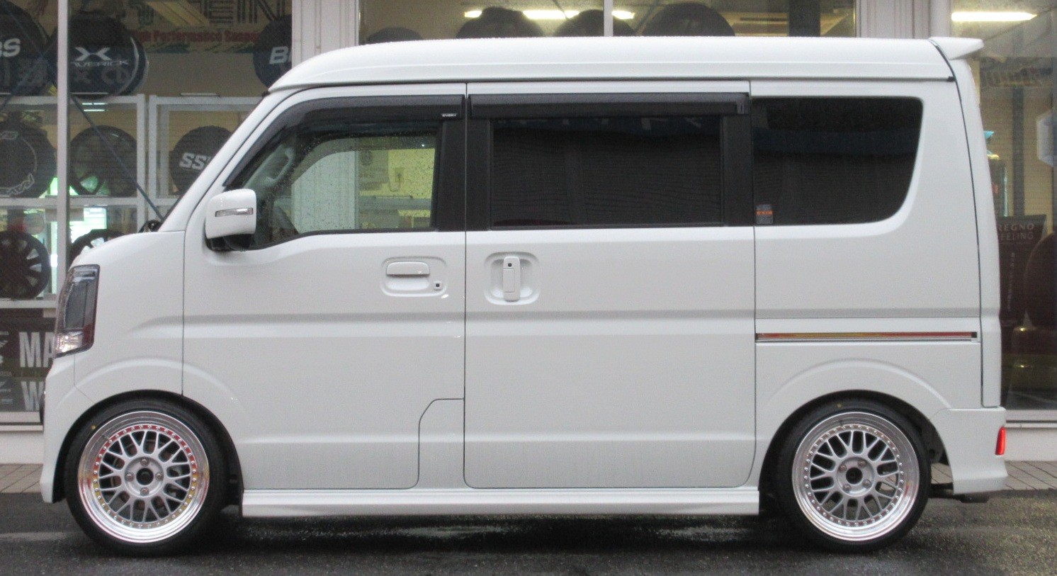 元々車高はかなり高めの部類の車種でもあるエブリイワゴンですが、かなりローダウンされた事が簡単にわかるくらいの変化ですね。
